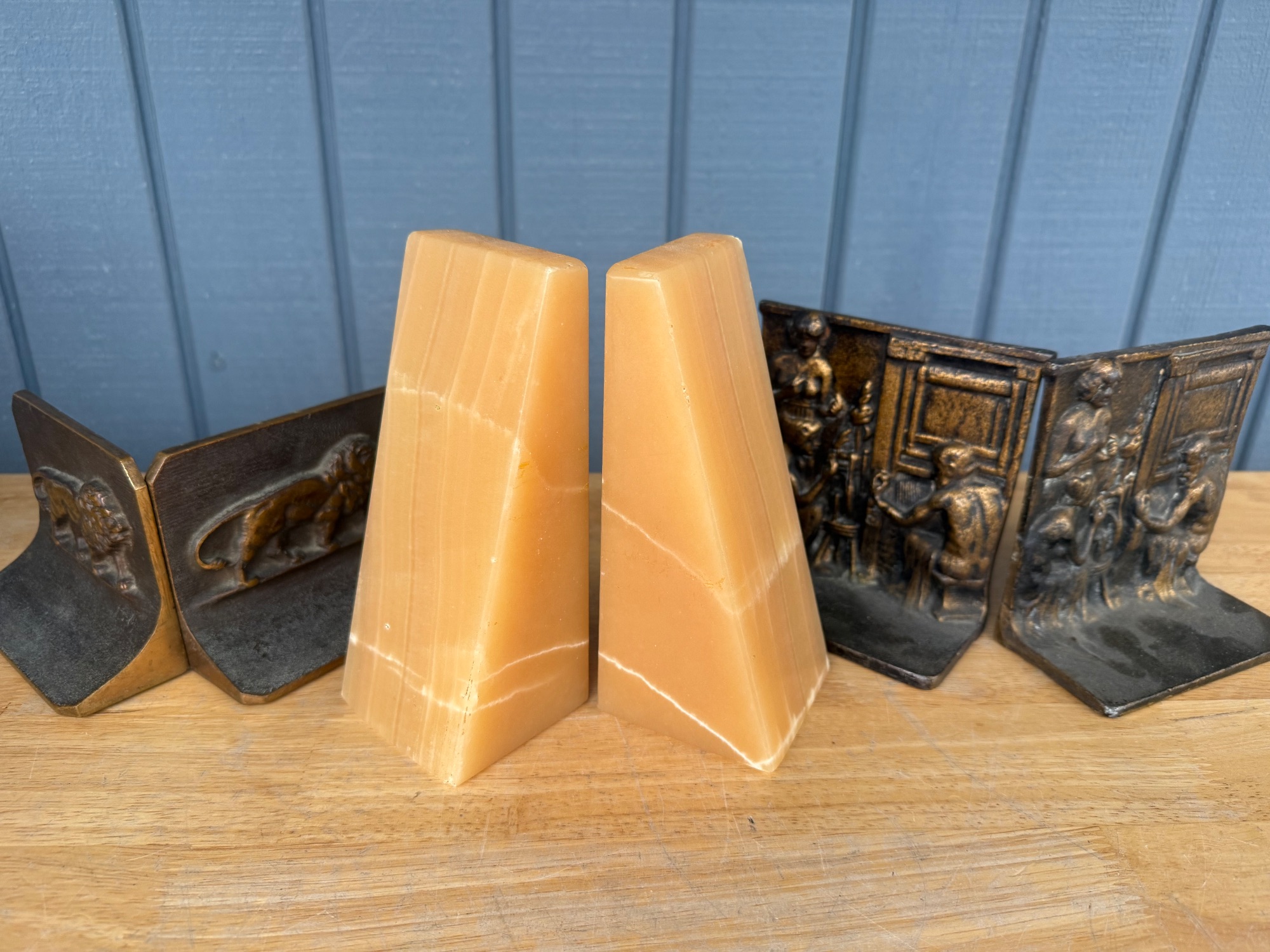 Ready to add some character to your bookshelf? Here's a set of bookends that are sure to spark conversation! You'll get not one, but three distinct pairs, ranging from the warm tones of stone, to intricately detailed bronze (or bronze colored). A great way to keep your favorite books from taking a tumble. See photos for condition and details.