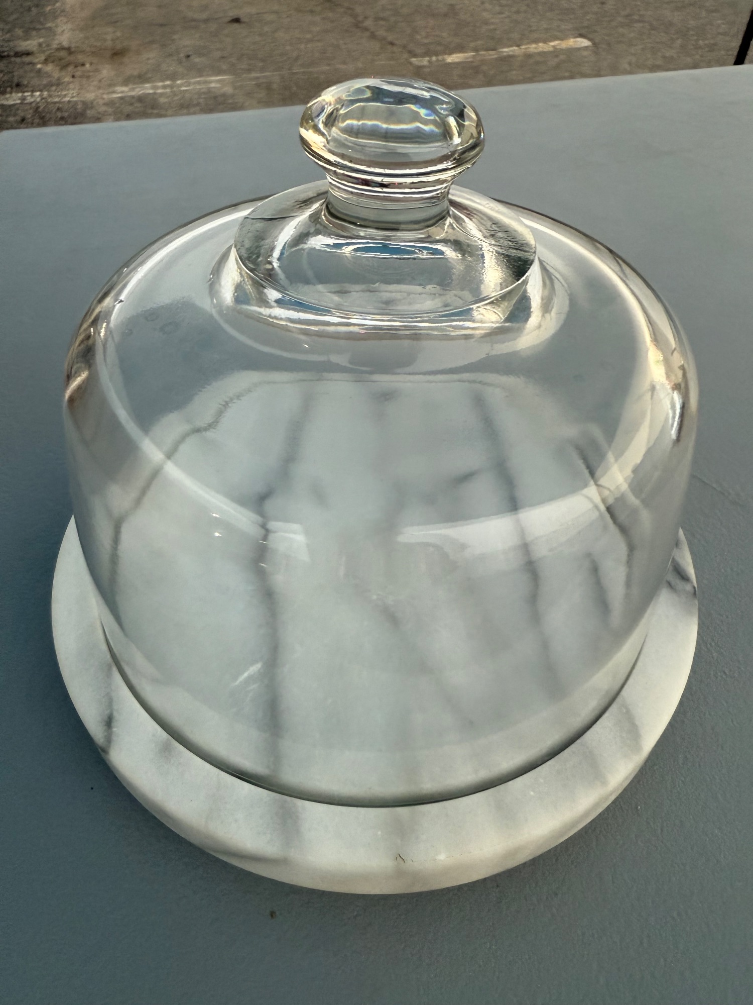 Add a touch of class to your home with this marble-based glass cloche. Perfect for displaying cheese, pastries, or anything else you want to show off! Great for use in the kitchen, on a dining table, or as a decorative element. Please examine the photos for a detailed look at the item.