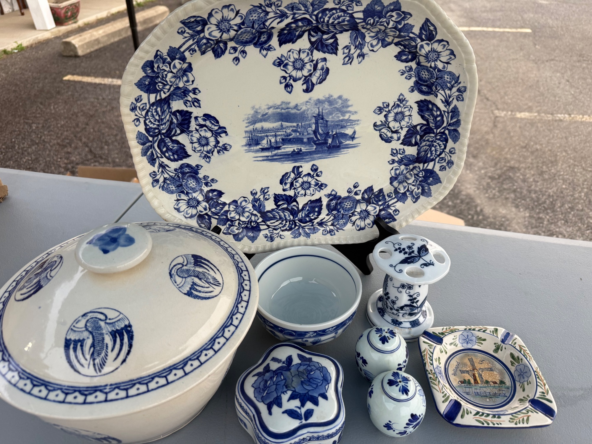 Step right up and feast your eyes on this delightful collection of Delft Blue ceramics! This lot features a captivating assortment of pieces, including a lovely platter, a lidded bowl adorned with bird motifs, a small bowl, a charming trinket box, a pair of salt and pepper shakers, a whimsical toothbrush holder, and an ashtray with a windmill design. Please inspect the photos closely for condition details and any imperfections that add to their story.