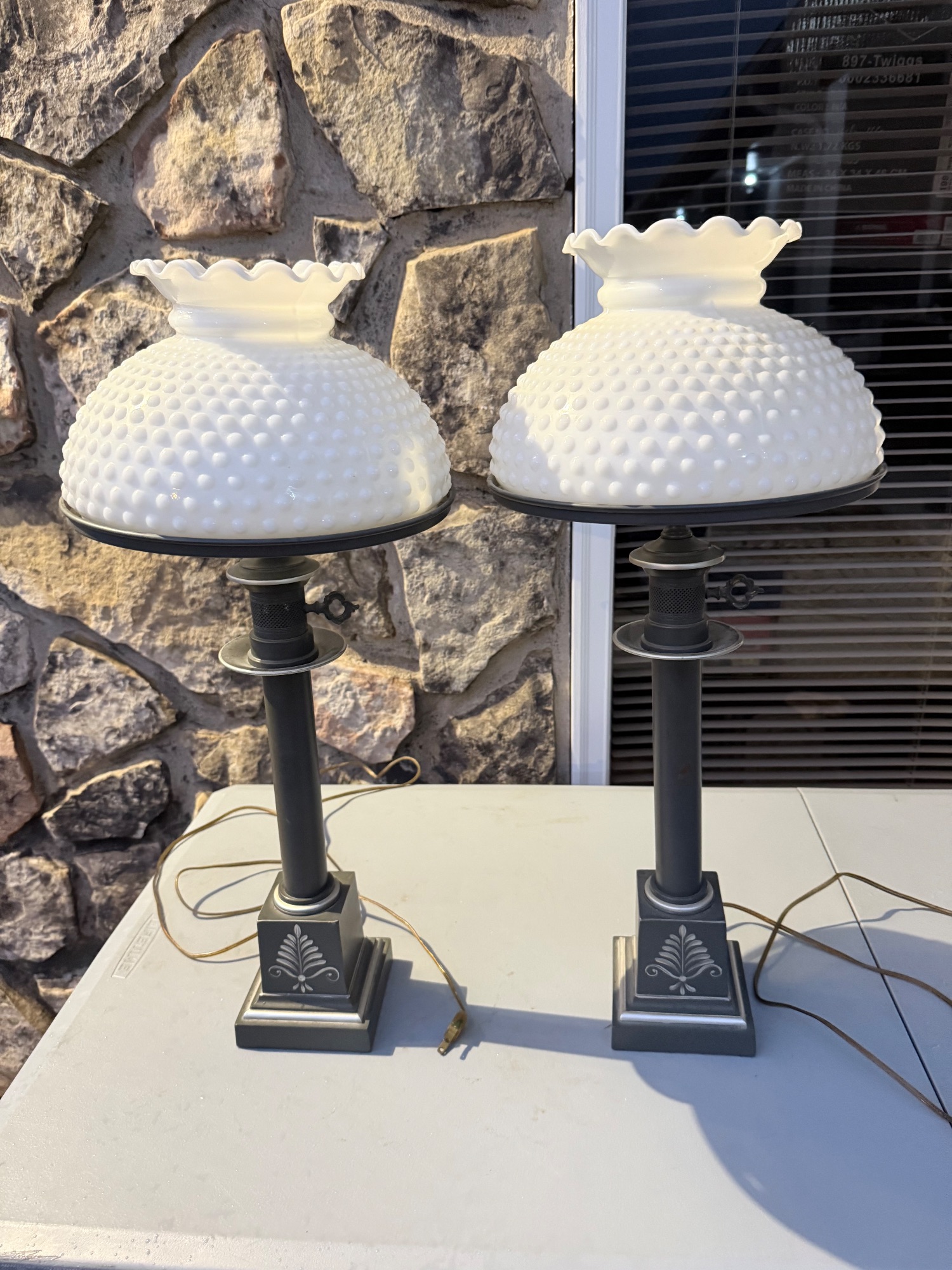 Behold, a dazzling duo of hobnail lamps, ready to illuminate your dwelling! These are not your average lamps; they're conversation starters! These lamps sport a milk glass shade, perched atop a stately base. See photos for condition and details.