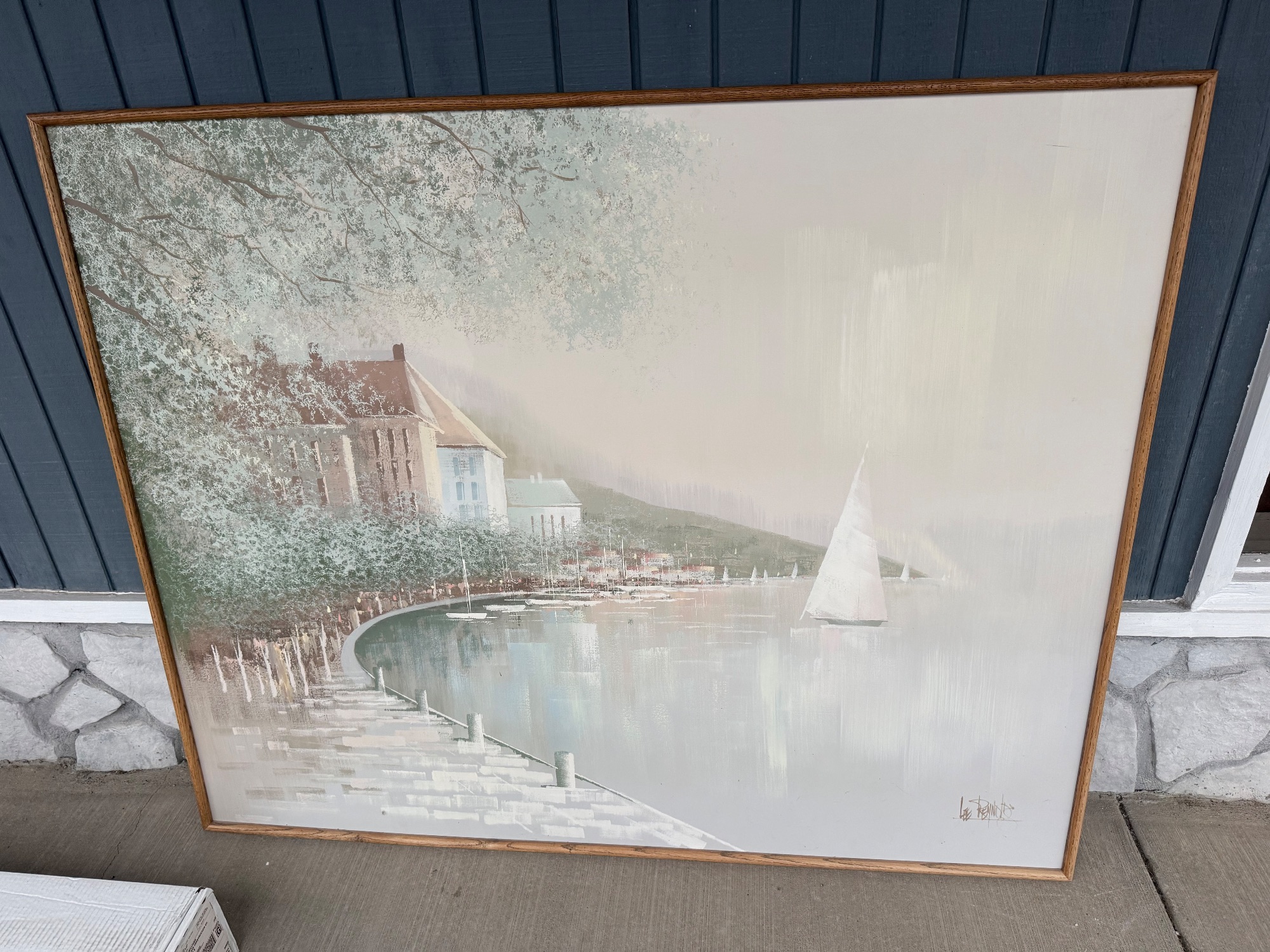 Add a touch of serene beauty to your space with this lovely framed painting, signed by the artist. This piece is a calming depiction of a seascape, featuring a sailboat gliding on the water, a building, and other smaller boats lining the pier. The frame is wooden. See photos for condition and details.