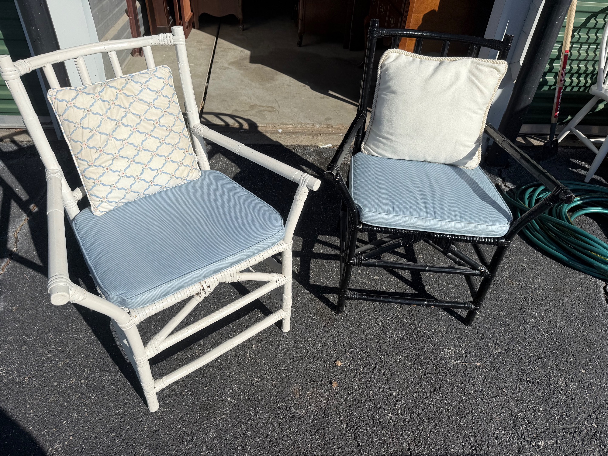 Get ready to relax in these cool-toned chairs! Perfect for adding a touch of understated elegance to your space. One armchair is painted white, the other black, and both chairs feature blue and patterned cushions. These charming armchairs will add a great style to any room. See photos for condition and details.