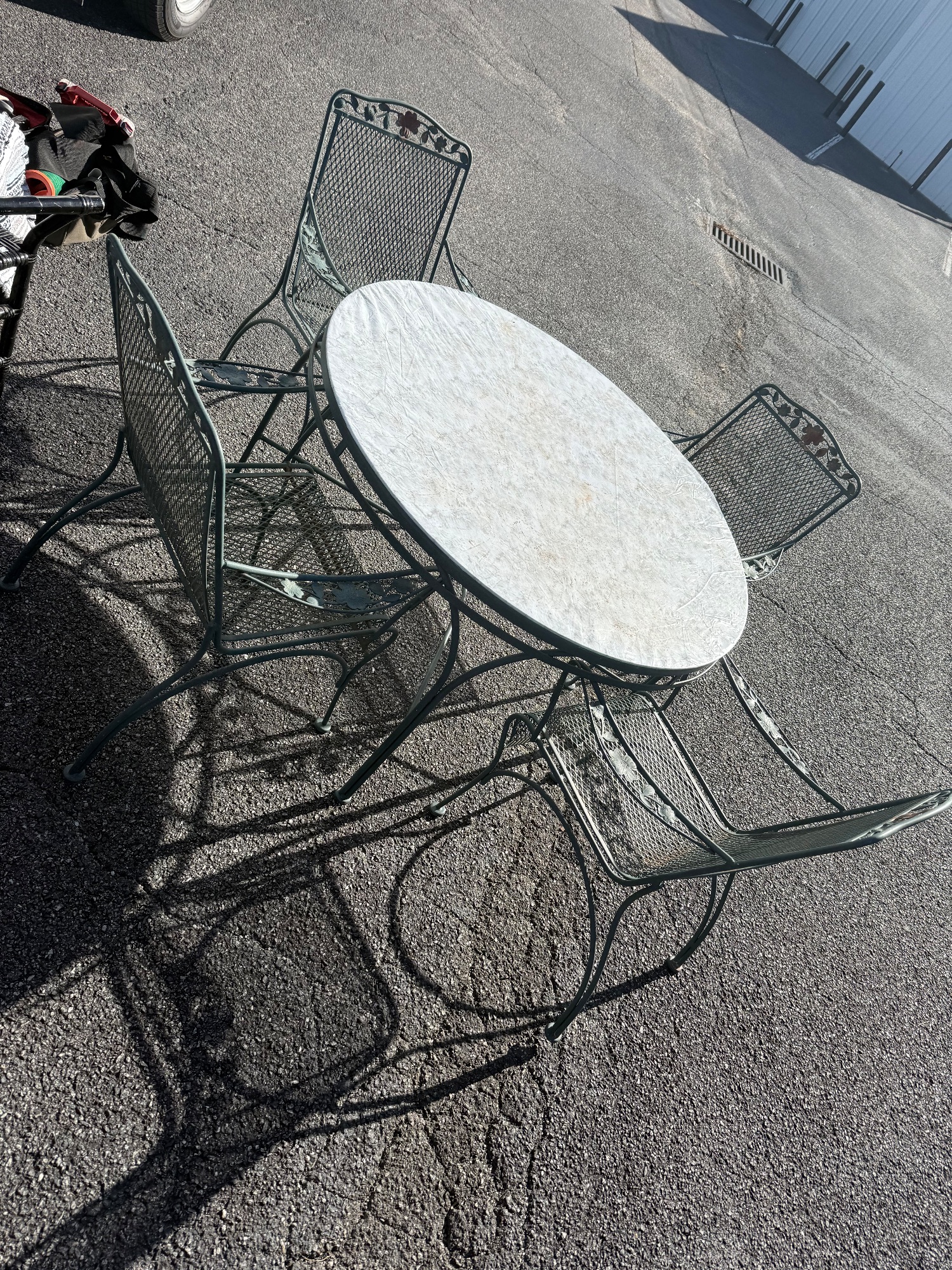 Gather 'round, outdoor enthusiasts! Up for grabs is a stylish patio set ready to host your next garden party. This charming set includes a round table and four chairs, all crafted from wrought iron and adorned with delightful floral details. Perfect for sipping lemonade on a warm afternoon or enjoying an evening meal under the stars. See photos for condition and details.