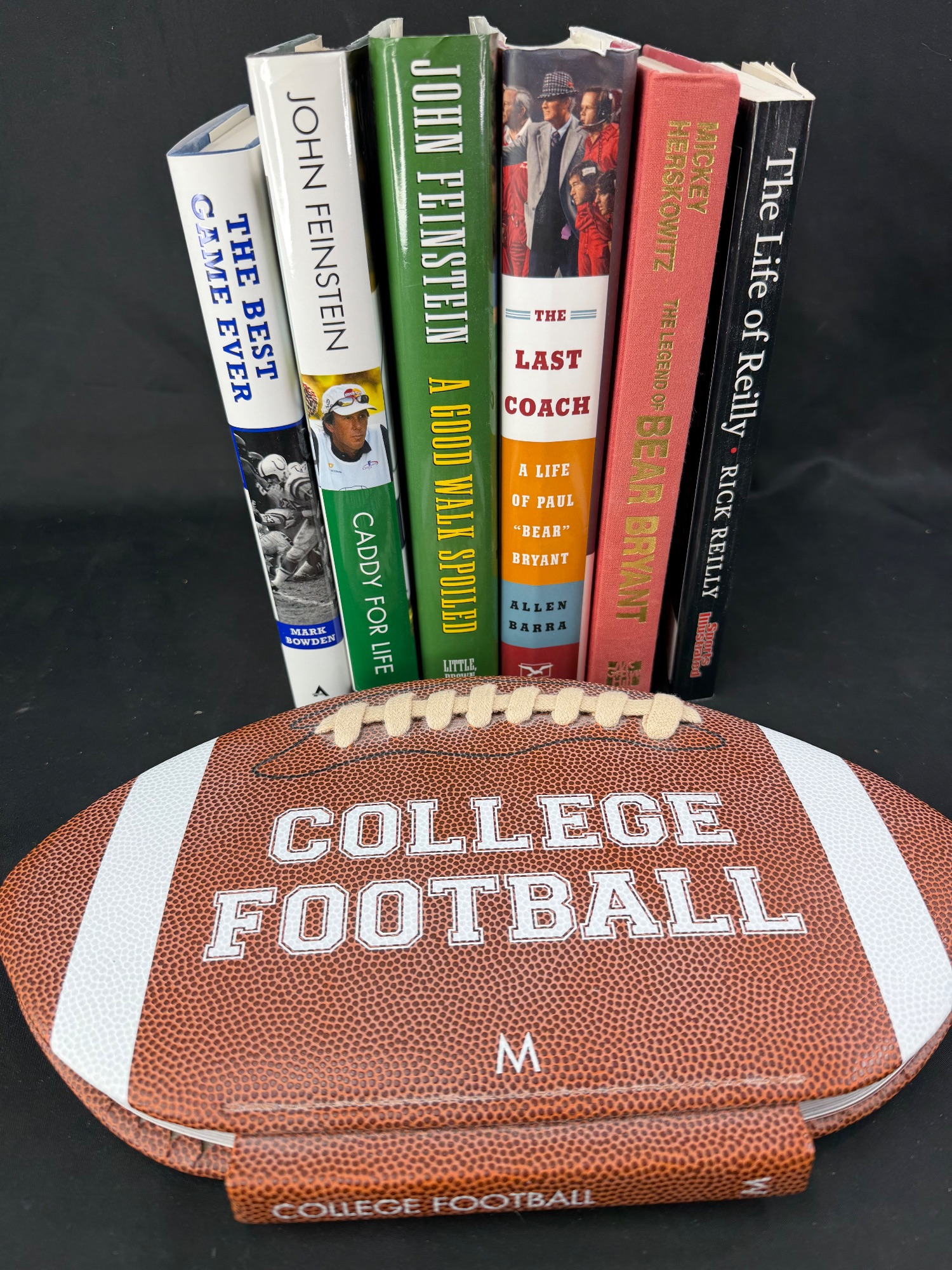 Get your head in the game with this collection of sports books! This lot includes titles by John Feinstein, Mark Bowden, Rick Reilly, and more. The Allen Barra signed edition of "The Last Coach" is a definite highlight. This collection also includes a College Football lined note pad that is the perfect place to keep track of all the scores. See photos for condition and details.