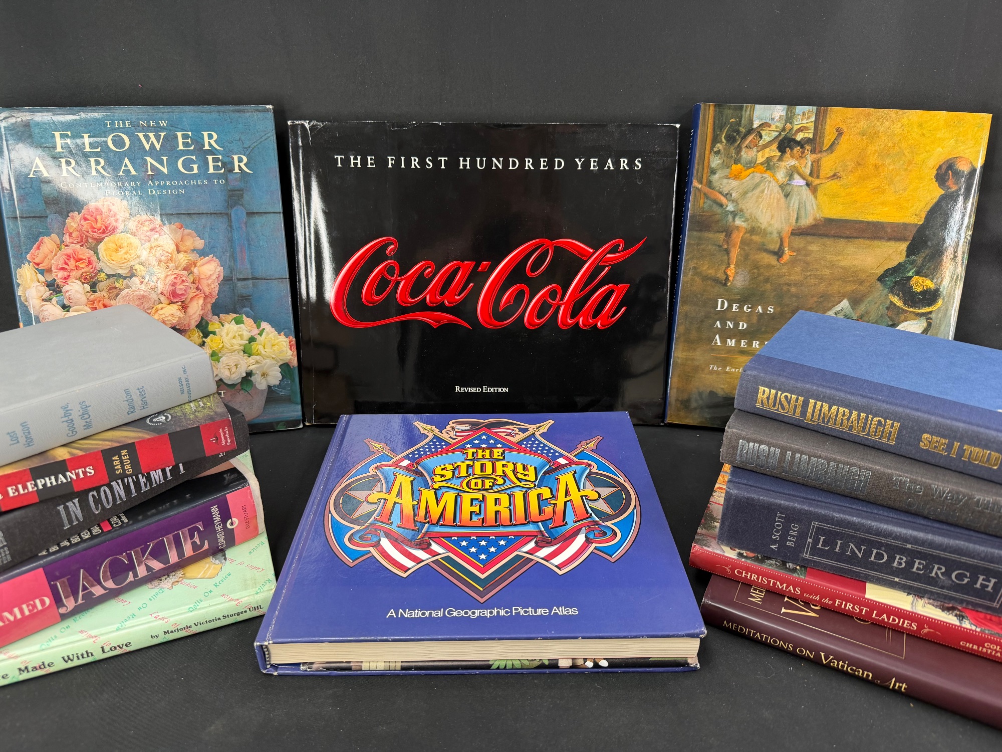 Dive into a world of knowledge with this collection of books! Featured are intriguing titles such as "The Story of America: A National Geographic Picture Atlas," "Coca-Cola: The First Hundred Years", "Christmas with the First Ladies", "Meditations on Vatican Art", "Degas and America" and many others spanning art, history, biography, and beyond. Explore the lives of Jackie Kennedy, the legacy of Rush Limbaugh, and the adventures of Charles Lindbergh, plus a few novels. See photos for condition and details.