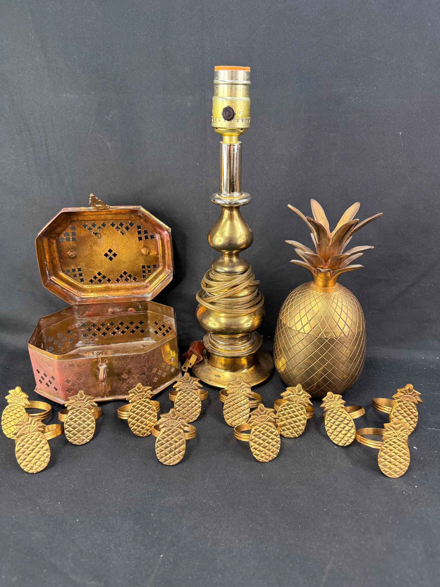 Dive into this shiny selection of brass items that are sure to make a statement in your home. Included in this lot is a decorative pineapple lidded container, an ornate trinket box, a lamp base, and 12 pineapple napkin rings. This dazzling display is perfect for adding a touch of quirky charm to any room. See photos for condition and details.