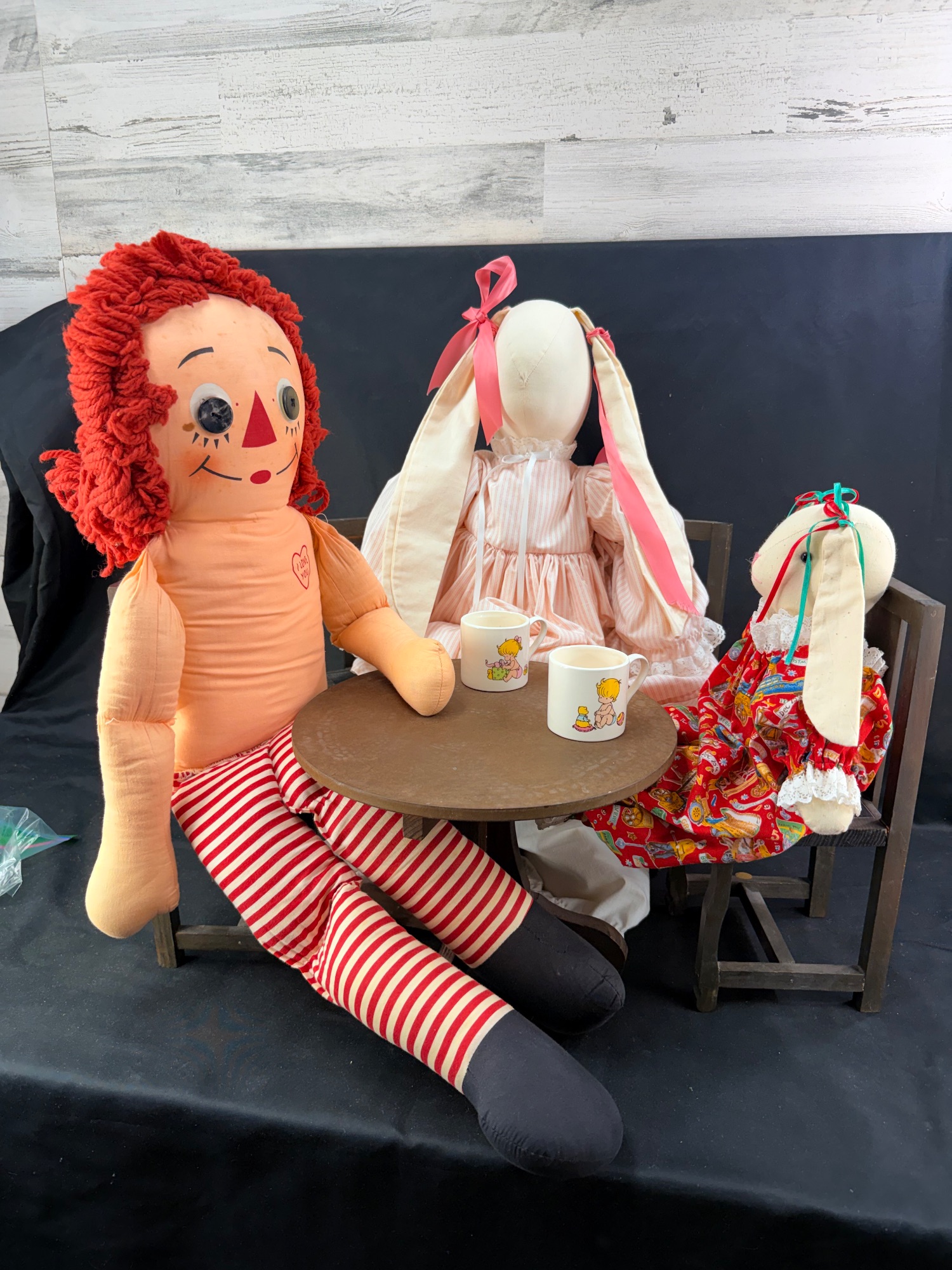 Ready for a delightful gathering? This lot features a charming assortment of playthings, including two adorable Joan Walsh Anglund mugs from 1978. Accompanying the mugs are three rag dolls, including a classic Raggedy Ann doll and two bunnies in dresses. To complete this whimsical set, there is a miniature child's table and four chairs that perfectly complements the dolls for an imaginative tea party. See photos for condition and details.
