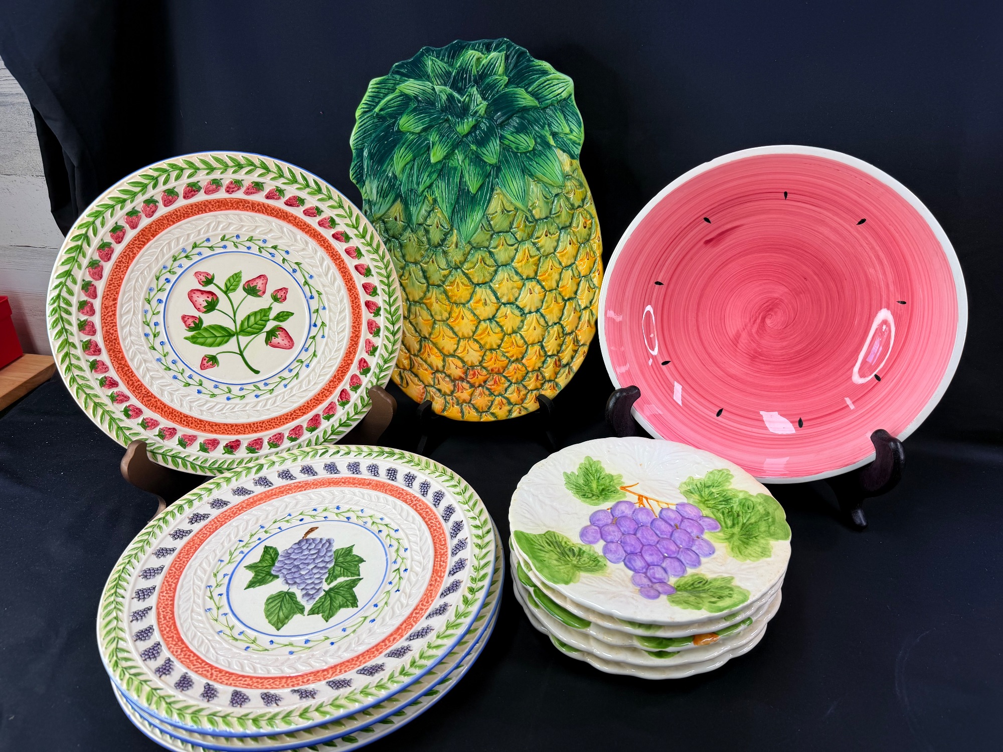 A fruity feast for your eyes! This collection of ceramic dishes brings a touch of garden-fresh charm to your table. Featuring a pineapple-shaped platter, a watermelon-themed bowl, and a delightful assortment of plates adorned with grapes, strawberries, cherries, pears, and peaches, this set is ripe with character. It's so cute you could just eat it! Well, don't. But definitely admire it. See photos for condition and details.