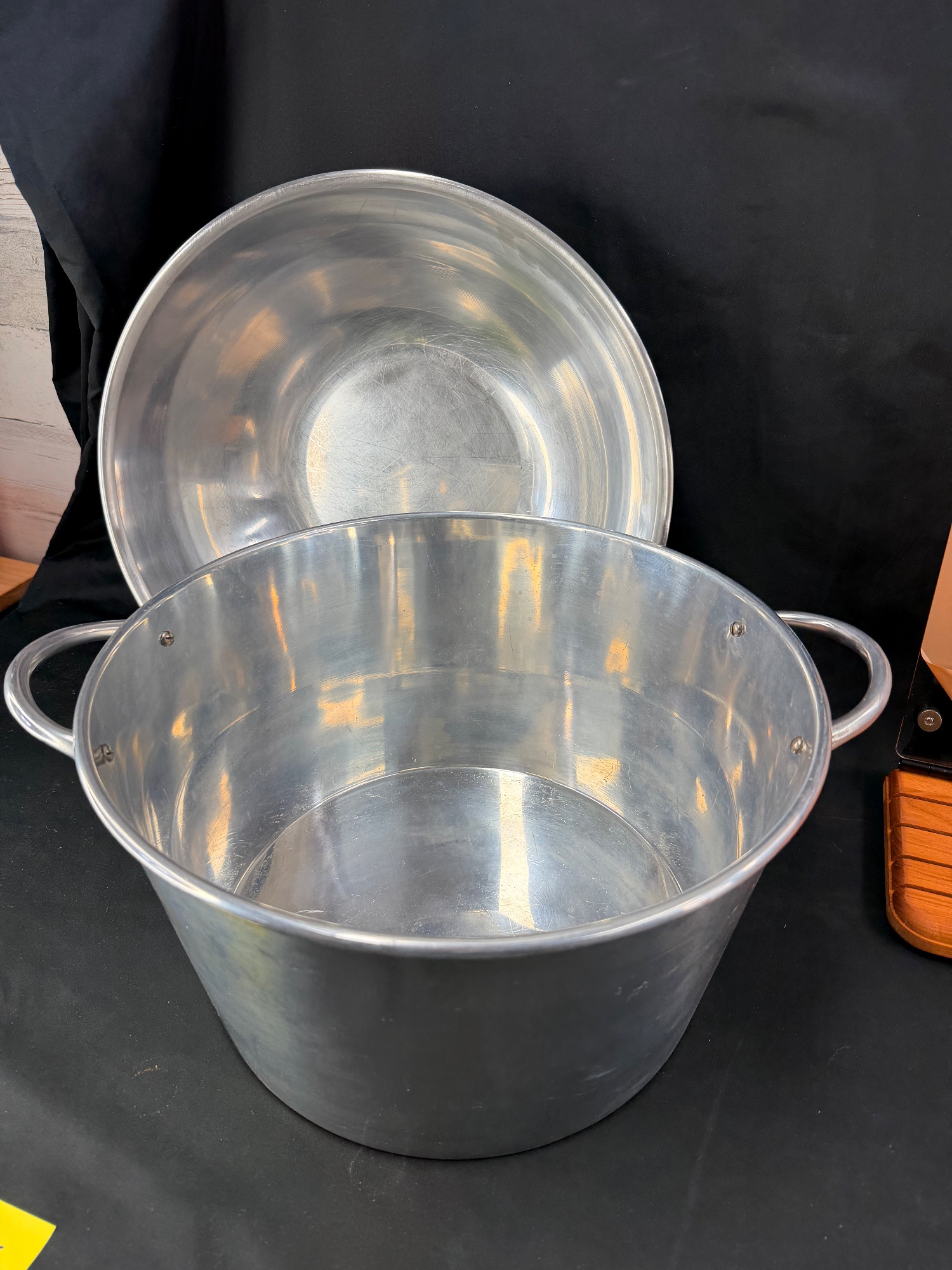 Elevate your kitchen game with this dynamic duo of aluminum! This two-piece set includes a large mixing bowl and a two-handled stockpot for various uses. Whether you're shuckin' corn, snappin' beans or maybe you just need a vessel for your next project, this set has you covered. See photos for condition and details.