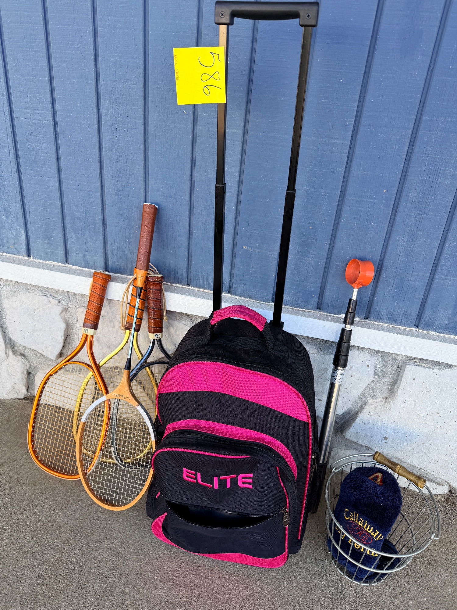 Get ready to strike it rich with this delightful collection! Includes bowling shoes, a ball (because what's bowling without one?), and a fetching pink and black rolling bag to keep it all tidy. Plus, some classic tennis racquets and a golf club head cover for good measure! See photos for condition and details.