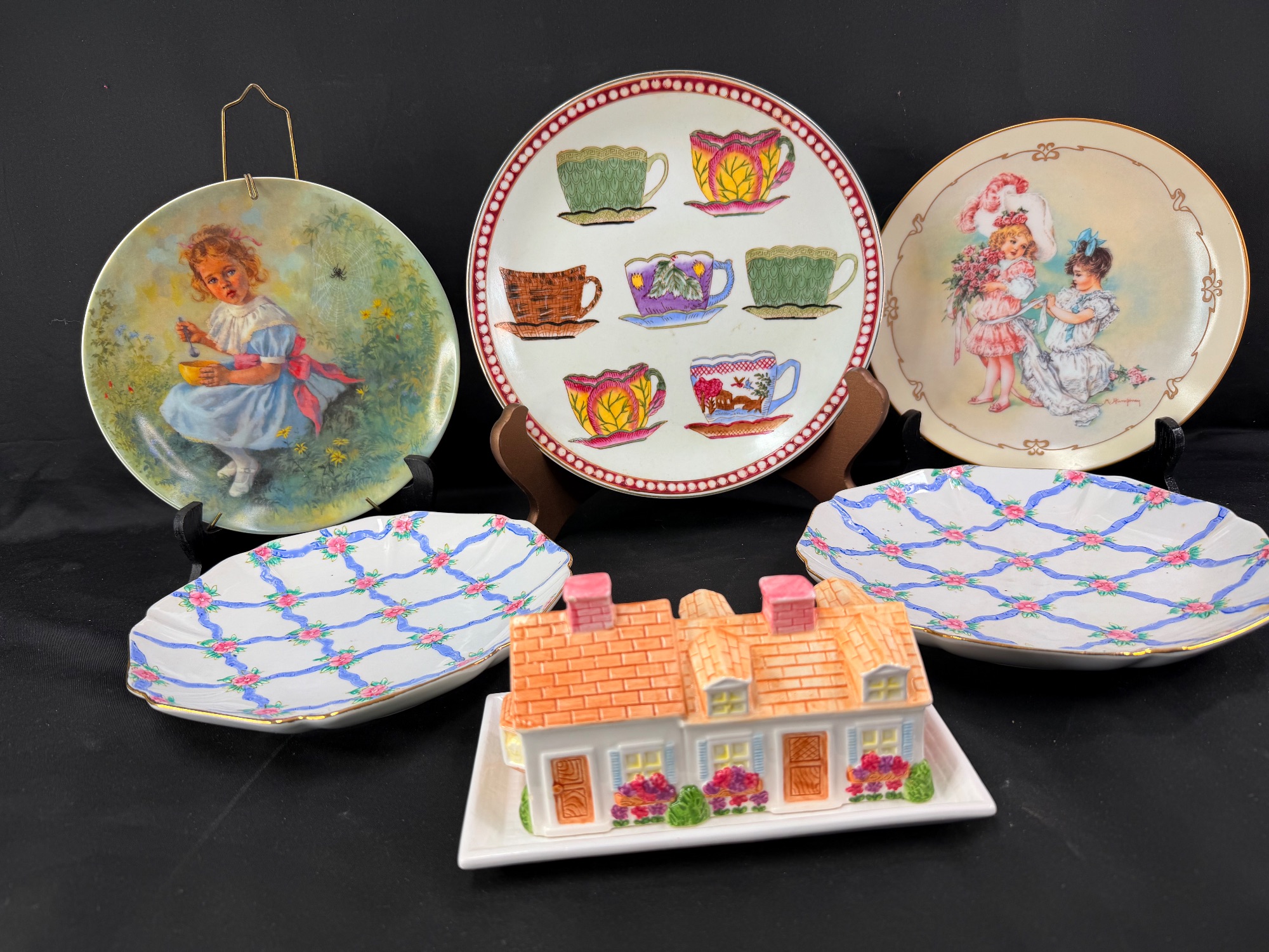 Feast your eyes on this whimsical collection of decorative plates! From charming floral patterns to delightful depictions of children, there's something here to tickle everyone's fancy. One plate features a darling cottage with flower box detail, complete with a rectangular base, while others showcase vibrant tea cups and playful scenes. These plates are sure to bring a touch of nostalgia and whimsy to any space. See photos for condition and details.