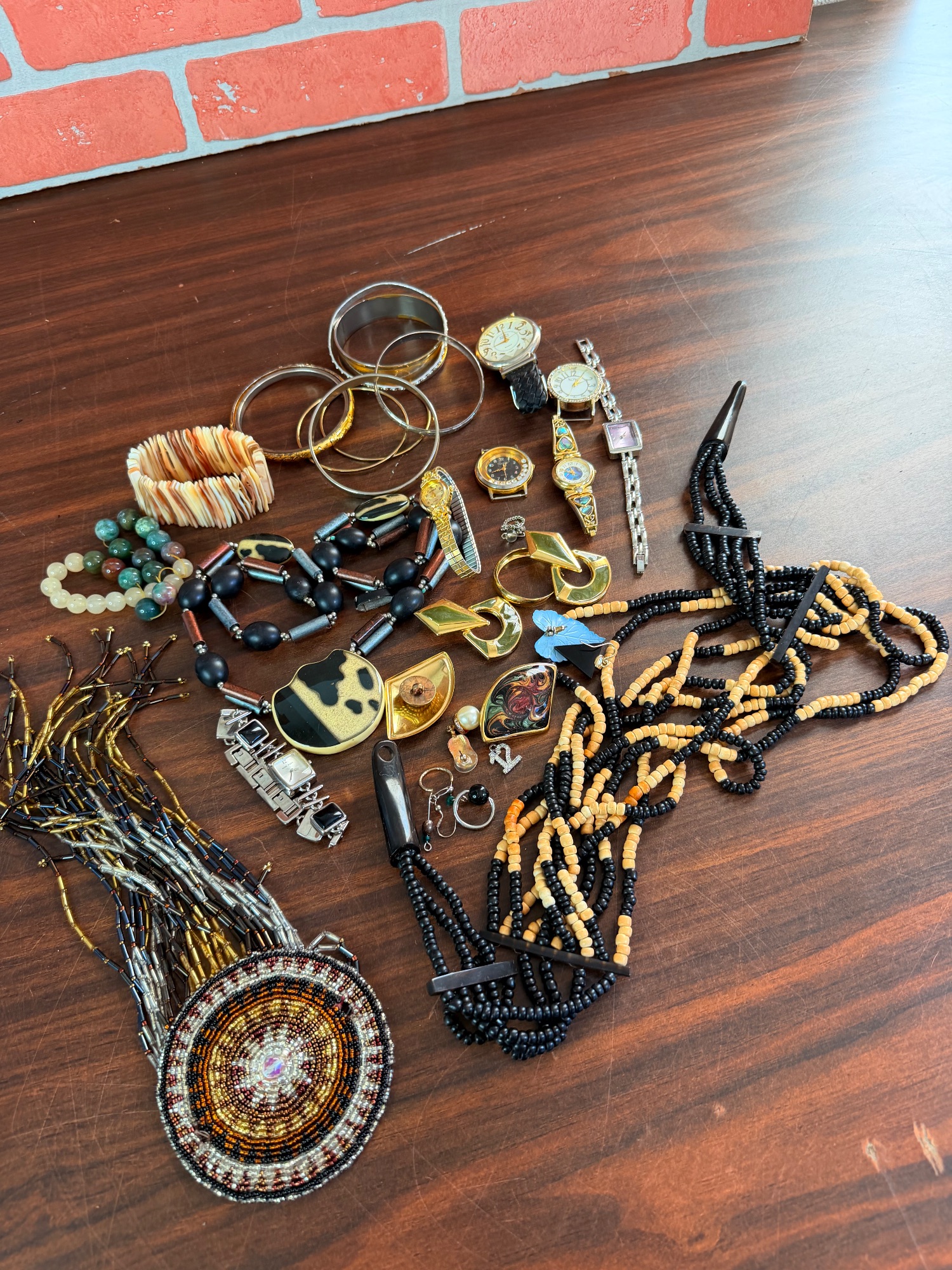 Dive into this vibrant mix of jewelry and timepieces, a treasure trove for the accessory aficionado! From beaded necklaces with unique flair to an array of wristwatches ready to tell their next stories, plus bangles, earrings, and brooches. It's a style kaleidoscope! Perfect for adding a quirky, eye-catching element to your look. See photos for condition and details.