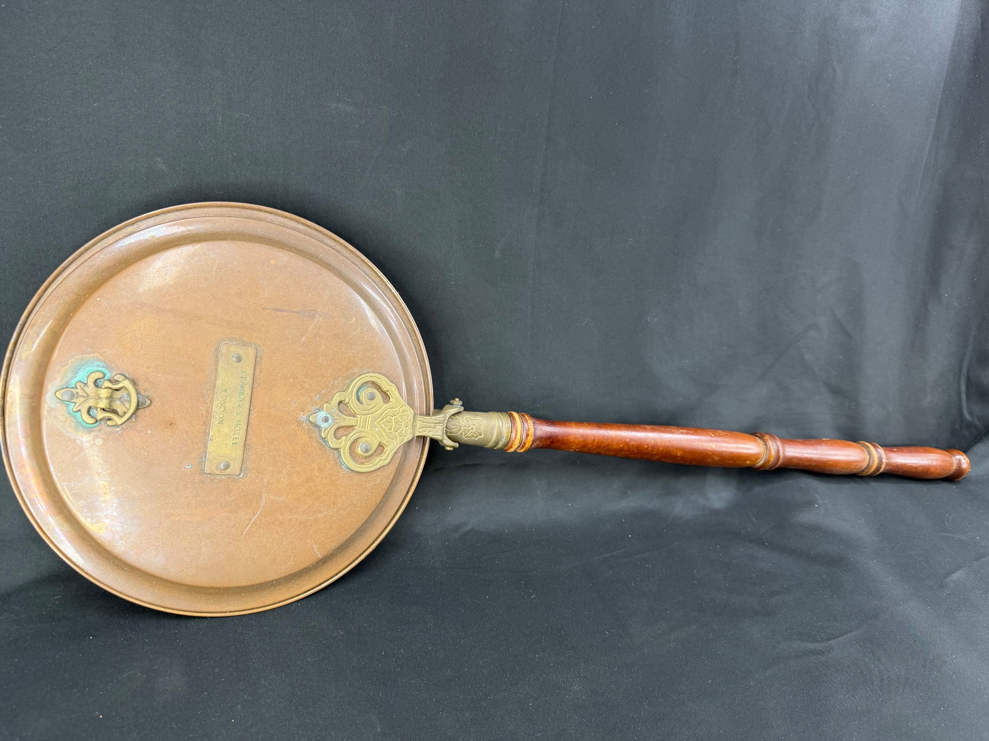 Warm your royal derrière with this charming Claridges Hotel bed warmer. With its copper construction, wooden handle, and brass accents, this bed warmer is sure to be a conversation piece. Perfect for adding a touch of elegance to your boudoir or using it as a unique decorative item. See photos for condition and details.