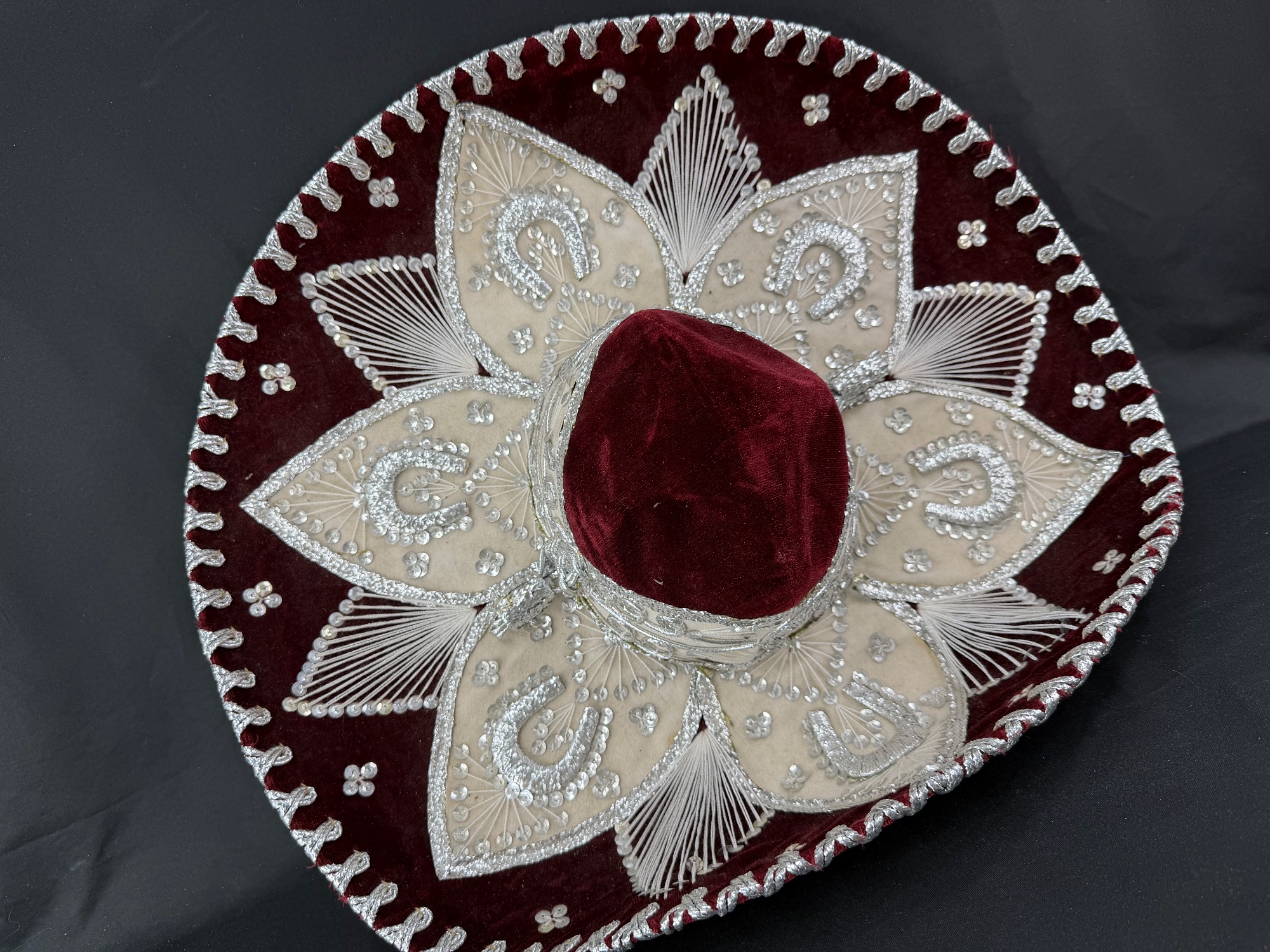 Get ready to shout "Olé!" This dashing Salazar Yépez sombrero is ready to bring the party! With its rich maroon color, intricate silver detailing, and classic sombrero shape, this hat is sure to turn heads at your next fiesta, Cinco de Mayo celebration, or even just a casual Tuesday. It features decorative tassels and embellishments. See photos for condition and details.