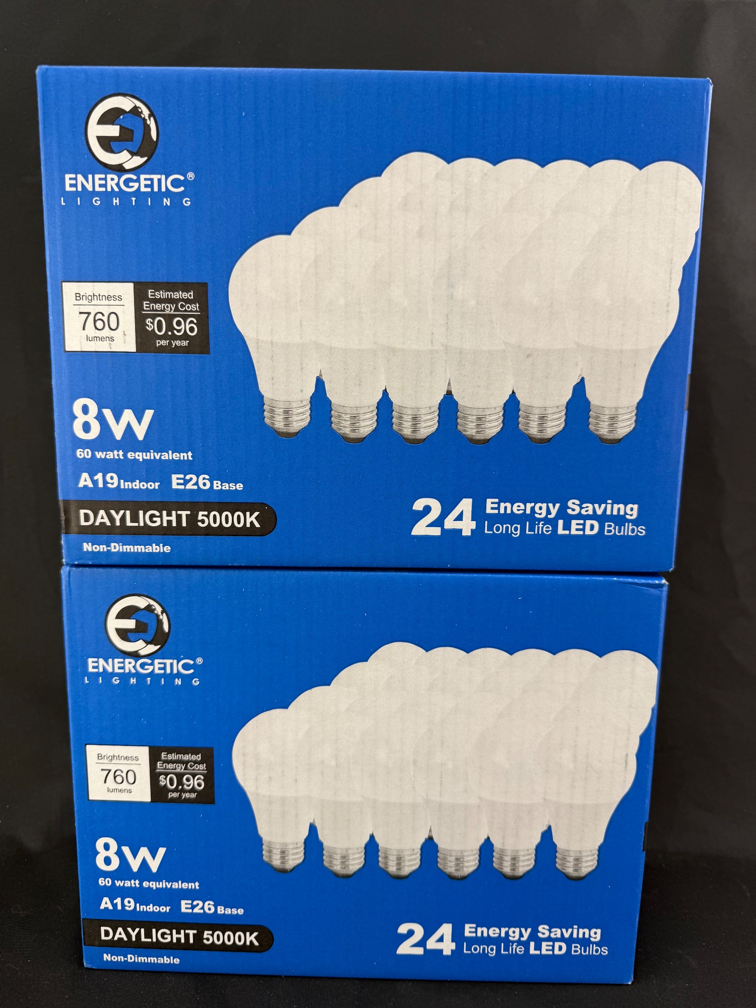 Brighten your day (or night) with these two boxes of Energetic Lighting LED Light Bulbs! Each box contains 24 daylight 5000k bulbs. These 8-watt wonders are non-dimmable, instant-on, and energy-saving, with an estimated yearly energy cost of only $0.96. Please see photos for details, features, and precautions.