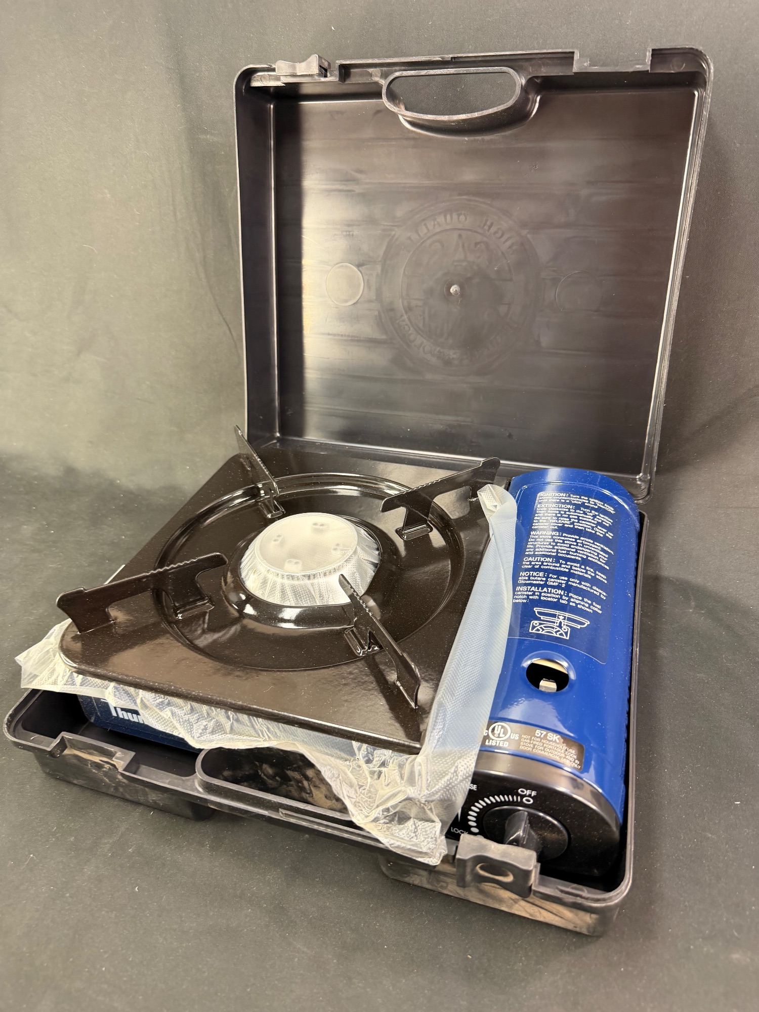 Get ready to cook up a storm with this portable gas range! Perfect for camping, tailgating, or just pretending you're a gourmet chef in your backyard. This handy unit features a sturdy design, a built-in case, and everything you need to start cooking right away (except the food, of course). Be sure to review the photos for a closer look at its features and condition.