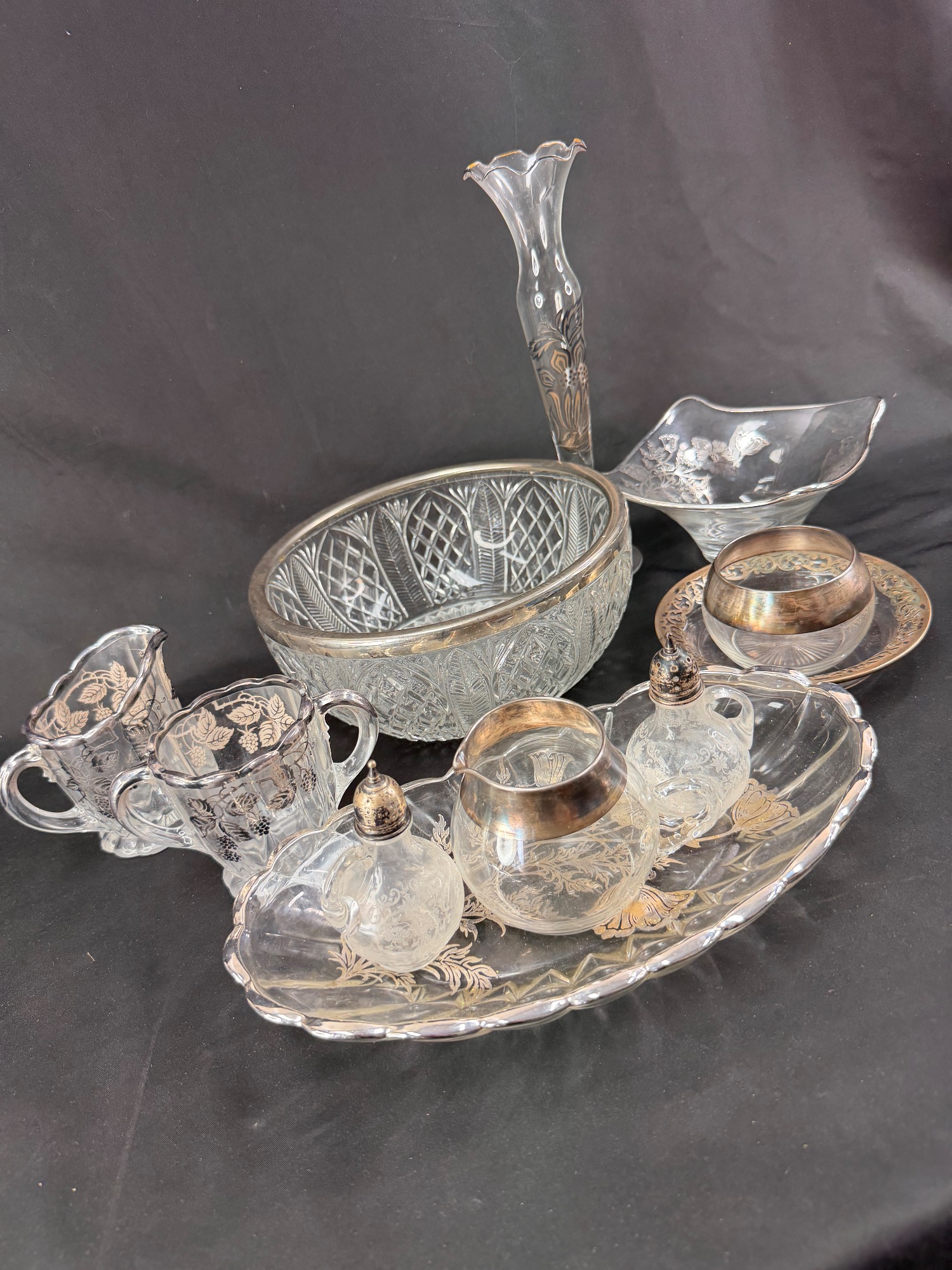 Step back in time with this lovely collection of glassware. Featuring decorative etched clear glass with elegant silver rims, these pieces add a touch of sophistication to any setting. Includes a variety of bowls, pitchers, and other assorted pieces, this is a lovely grouping of glass for anyone with an eye for something unique. See photos for condition and details.