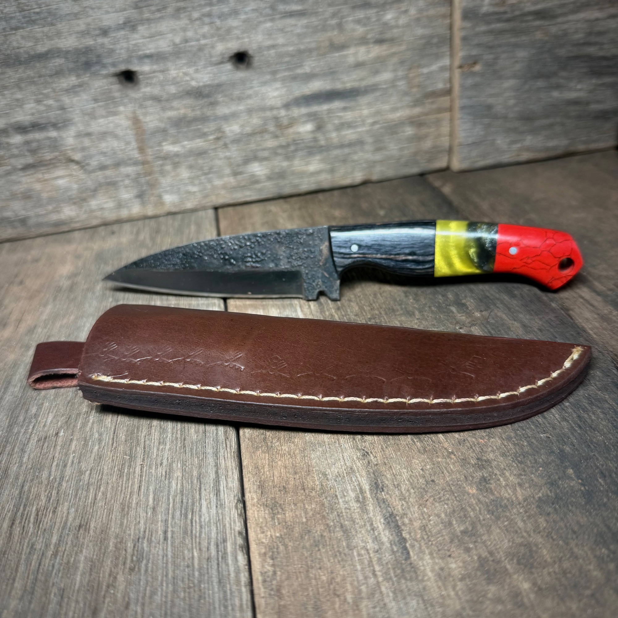 Fixed blade knife with a dark textured steel finish and a vibrant handle in red, yellow, and black. Paired with a stitched leather sheath for protection and carry. A striking piece with a bold, modern edge. See photos for details on condition/measurements or other applicable information.