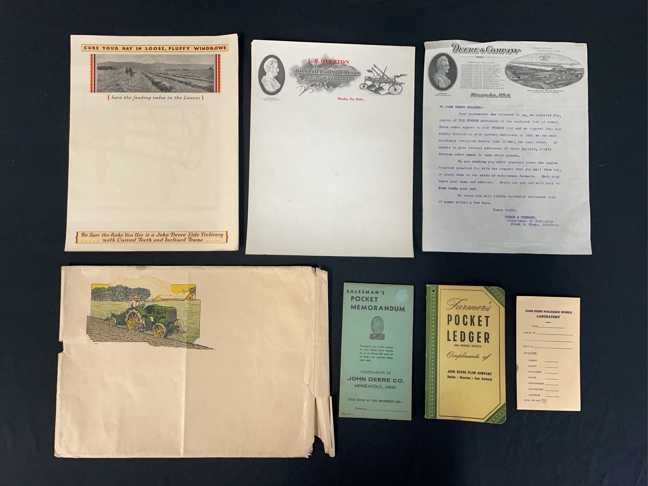 Lot of John Deere literature including Farmers Pocket Ledger, letterheads, envelopes, and Salesman's Pocket Memorandum. Varying condition.