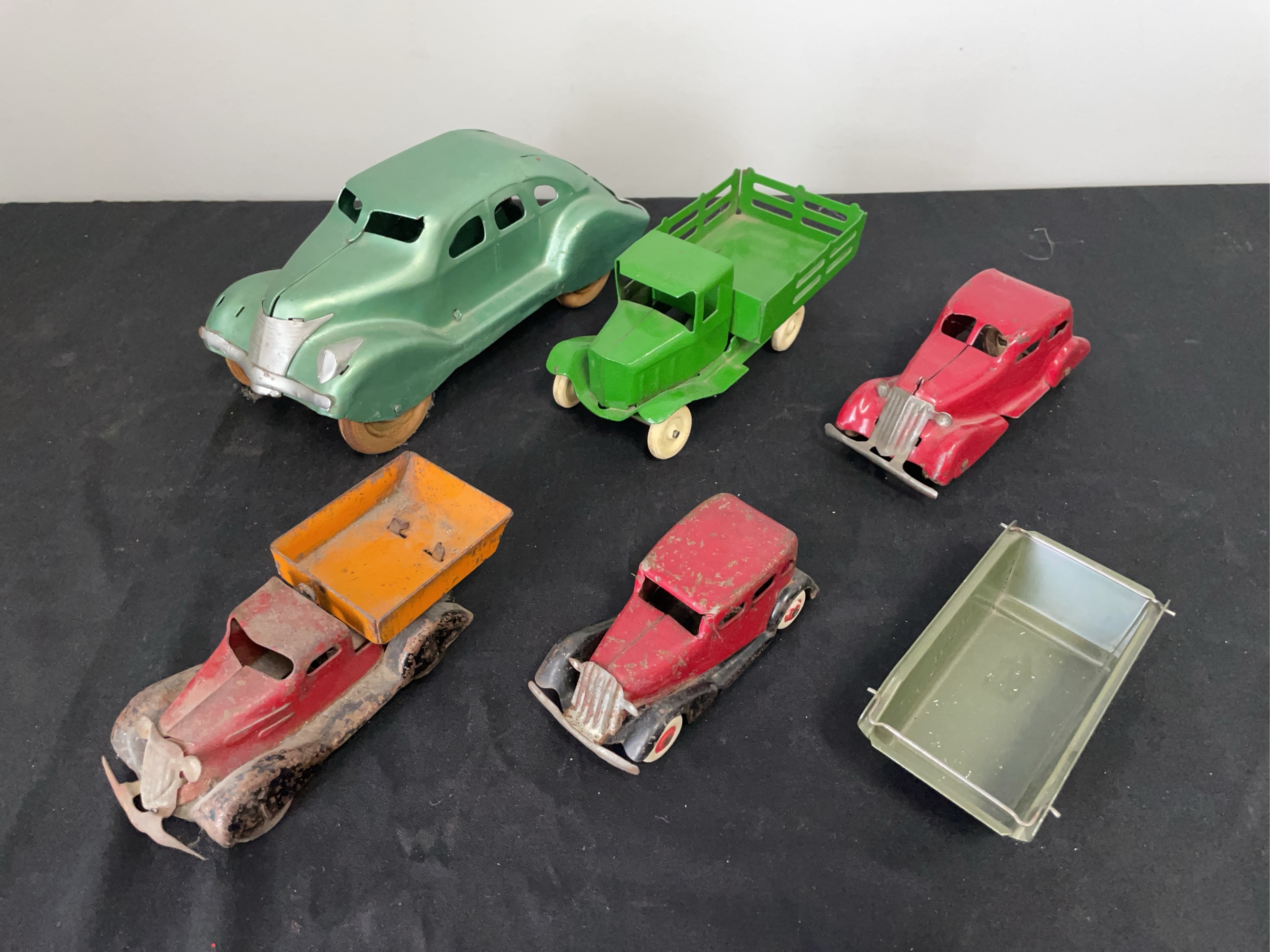 Lot of 6 cars and trucks and hopper. Varying condition.