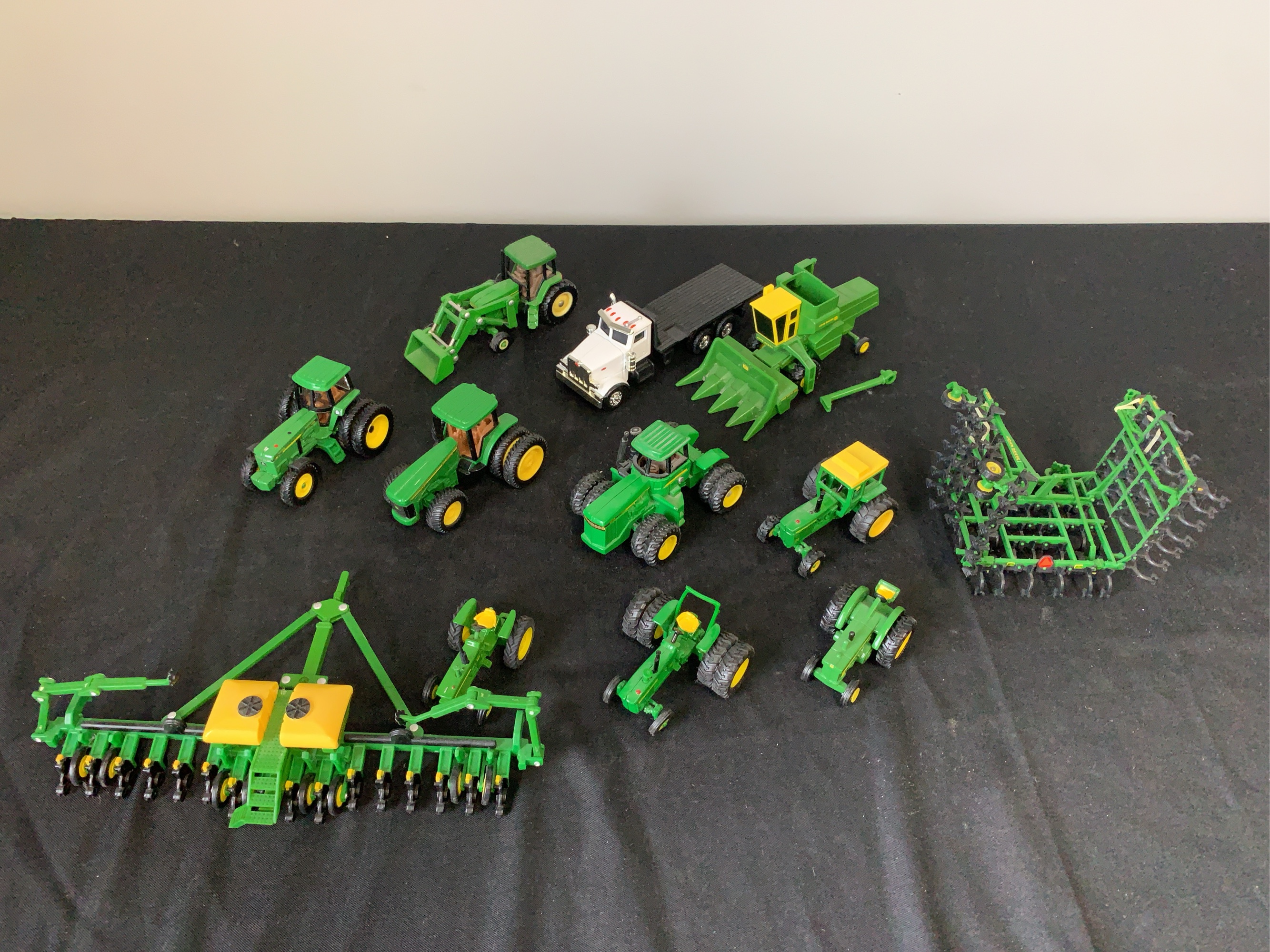 Lot of twelve 1/64 scale John Deere made by Ertl. Varying condition.