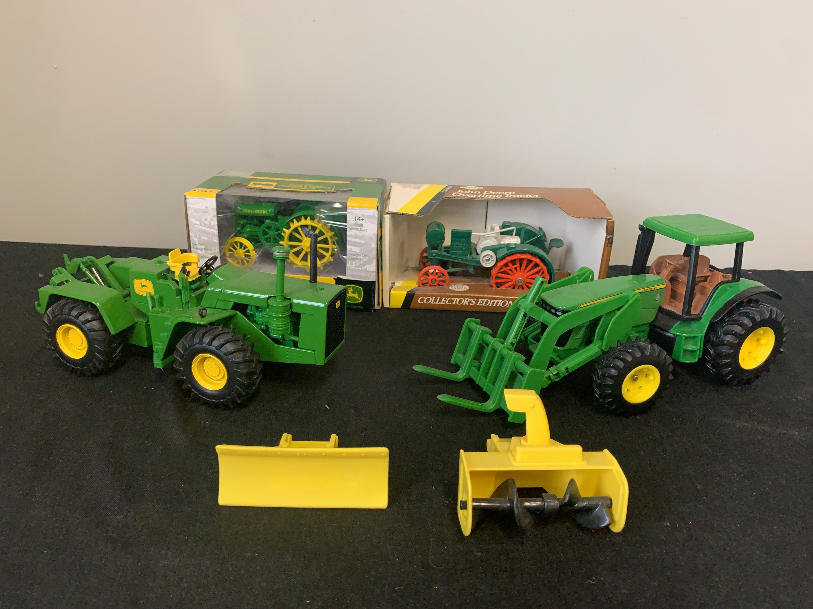 1/32 scale John Deere tractor with loader and accessories. Good condition.
