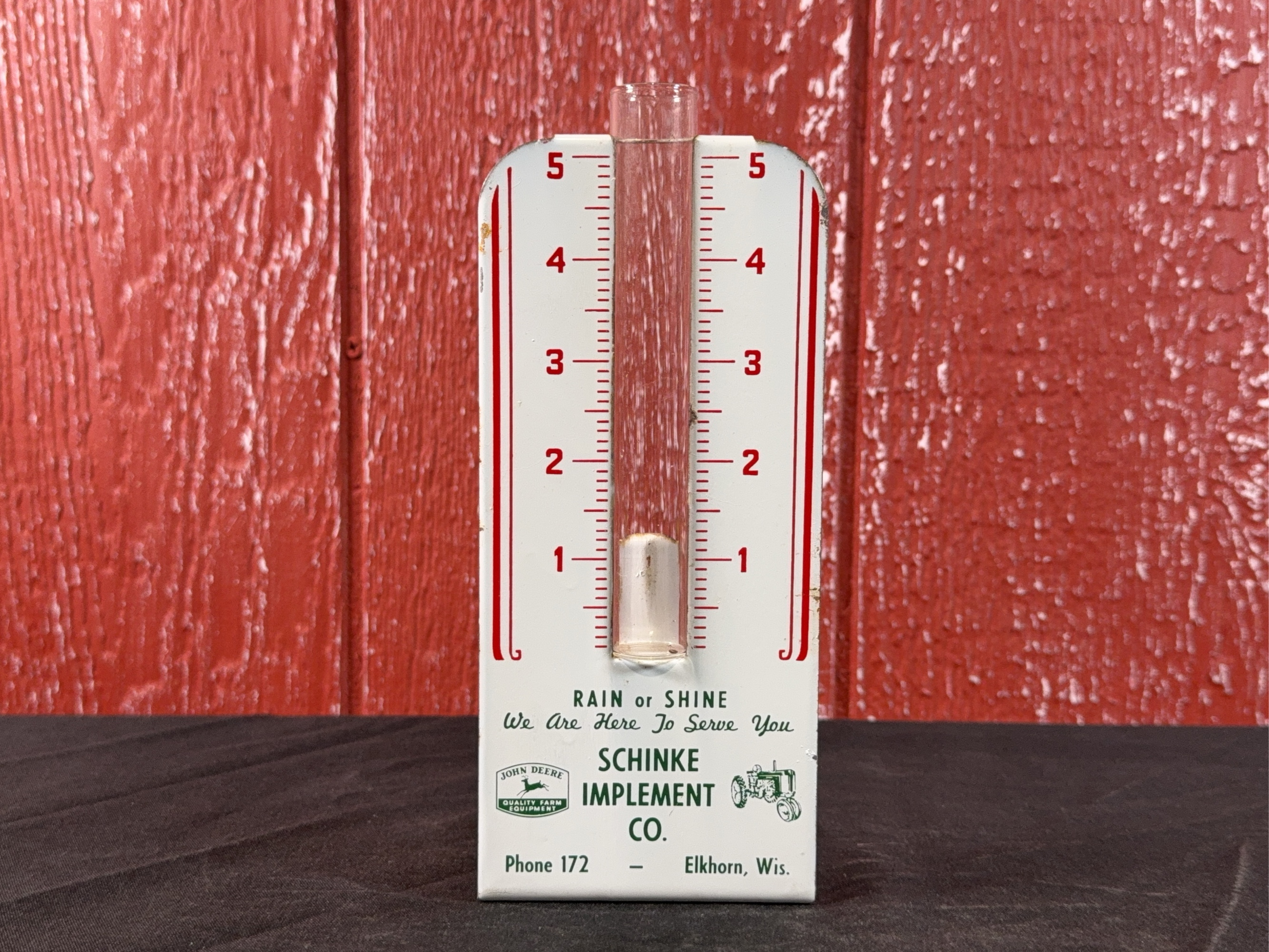 John Deere rain gauge from Schinke Implement Co. Shows light wear with some rust.