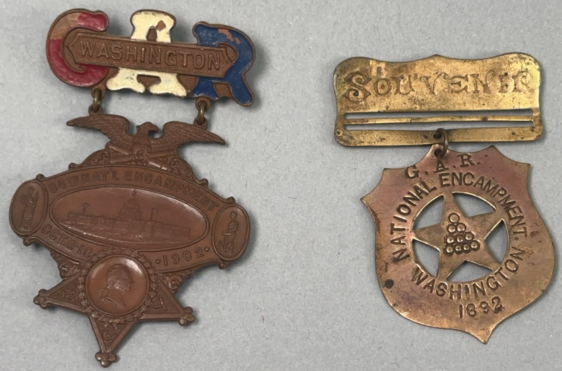 The Civil War memorabilia stands out - not just swords and bayonets, but the kepi cap of an 83rd Ohio Infantry soldier. Somewhere in the chaos of Gettysburg or Antietam, a young man from Ohio wore that cap. He survived to join the Grand Army of the Republic, whose extensive badge collection here documents decades of veterans' encampments from the 1880s through the 1920s - old soldiers gathering to remember fallen comrades and preserve their legacy.