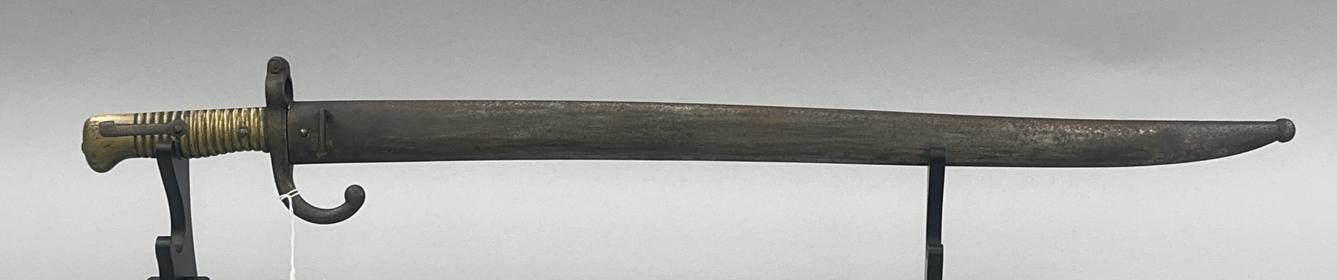 French Model 1866 Chassepot yataghan bayonet bearing matching serial number "78075" on both bayonet and scabbard, indicating original arsenal-paired set. Guard displays "L" in circle arsenal mark and French king's head proof stamp on ricasso, confirming government inspection and military acceptance. Curved single-edged blade with brass handle featuring ribbed grip design typical of Second Empire military issue, steel guard showing period wear with honest service patina consistent with 1860s-1870s use. Designed to fit the Fusil Modèle 1866 Chassepot rifle used by French forces during the Franco-Prussian War era. 22.5" Blade