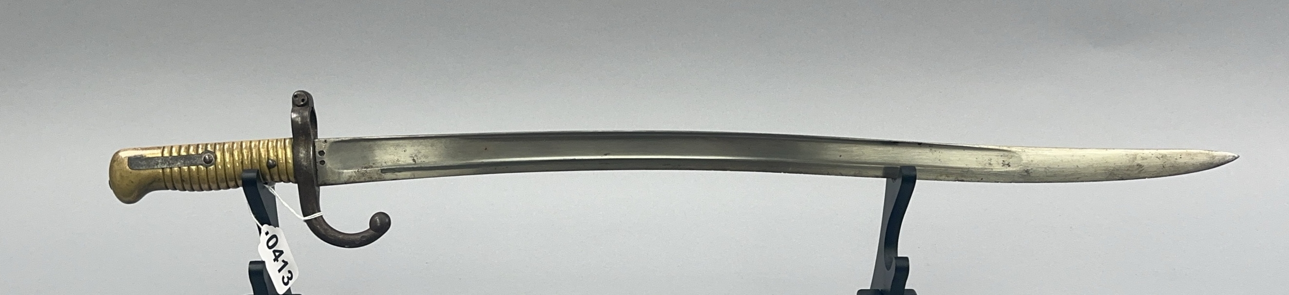 French M1866 Chassepot yataghan bayonet with ricasso markings "F 3085" indicating arsenal production and serial number. Distinctive curved single-edged blade with brass handle featuring grooved grip design typical of Second Empire French military issue. Complete with matching steel scabbard displaying period wear, designed to fit the Fusil Modèle 1866 Chassepot rifle used by French forces in the Franco-Prussian War era. 22.5” Blade