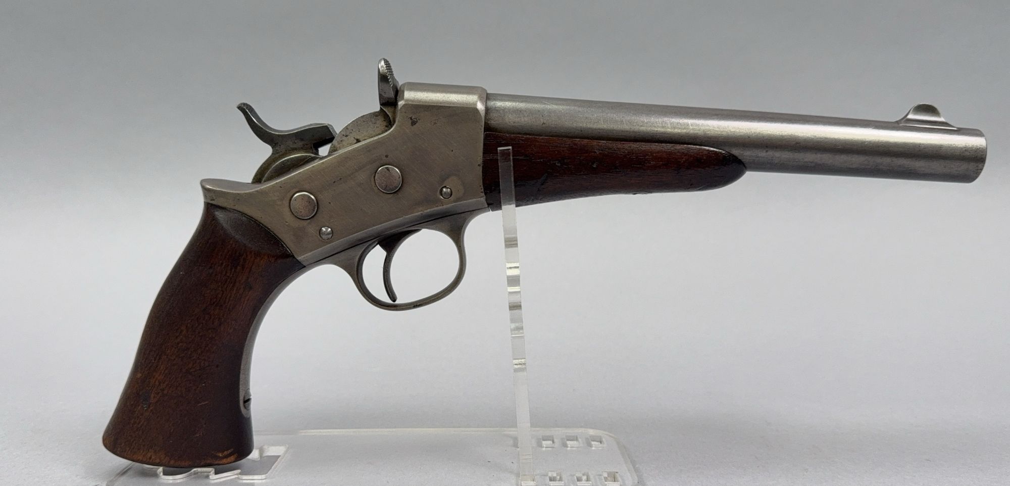 Remington Rolling Block Navy Model 1871 single‑shot pistol, .50 caliber centerfire, with 8" round barrel and blade front sight. Satin gray patina on barrel and frame with clear “REMINGTON’S ILION N.Y. U.S.A.” and patent date markings on the right side; “P” and “S” inspection letters remain sharp. Walnut forearm and grip show period handling marks and small dings but retain a well‑cared‑for, un-sanded appearance with tight wood‑to‑metal fit. Action operates properly with positive rolling block lock‑up; bore shows defined rifling with scattered frosting consistent with age, not test‑fired by the auction company. Attractively housed in a later fitted display case lined in blue felt, making a desirable example of the classic U.S. Navy rolling block pistol for the antique handgun collector.