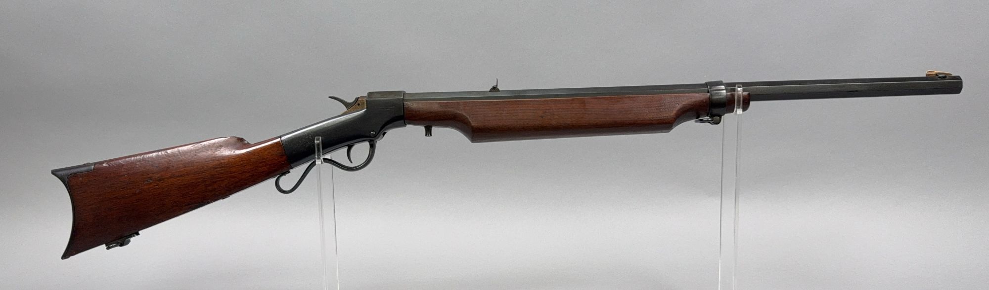 Merwin & Bray–marked Ballard single‑shot sporting rifle, serial 16581, Octagon barrel with “MERWIN & BRAY, AGTS, NEW YORK” legend and “BALLARD’S PATENT NOV. 5, 1861” receiver marking, retaining a pleasing blue/brown mix with sharp edges and honest age speckling. Smooth walnut buttstock and forearm show scattered handling marks and small dings but remain solid with good wood‑to‑metal fit and crescent steel buttplate. Action operates properly with smooth hammer and falling‑block function; bore shows defined rifling with some frosting typical of a period sporting rifle and has not been test‑fired by the auction company. Attractive example of a Merwin & Bray–retailed Ballard rifle for the Civil War and early metallic‑cartridge collection. Does appear to have some refinish work completed.