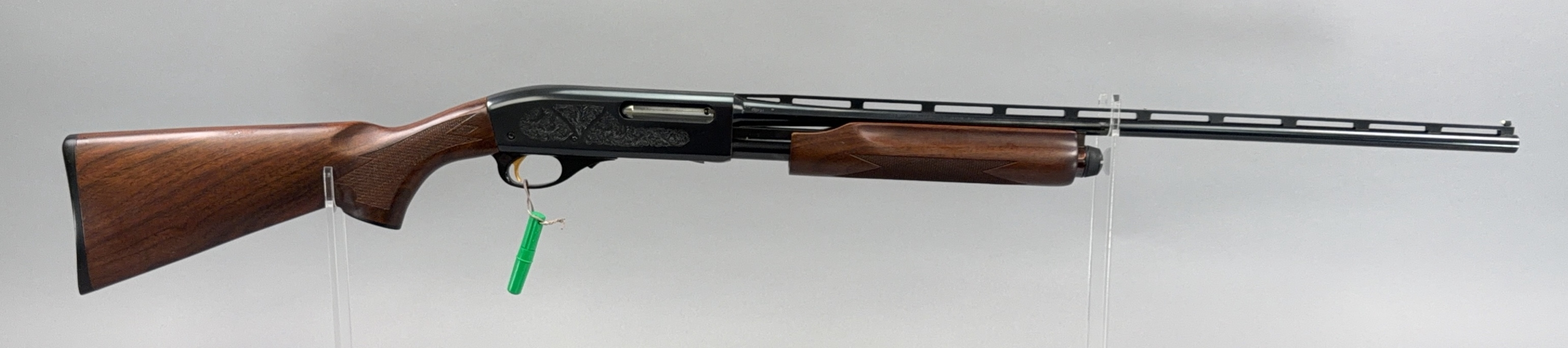 Remington 870 Wingmaster .410 gauge pump shotgun with ventilated rib barrel and polished blue finish; checkered walnut stock and fore‑end show light field handling marks but remain solid with good gloss; metal retains strong blue with minor carry wear; action cycles smoothly and safety functions properly, bore is bright; choke and barrel length per markings
