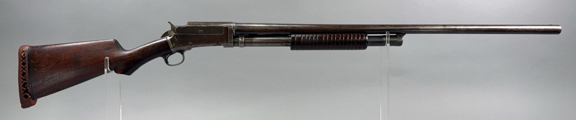 Marlin Model 1898 pump-action shotgun, 12 gauge, with correct barrel legend “Marlin Fire Arms Co. New Haven, CT U.S.A. Pat’d Nov. 6, 1894, May 12, 1896 & June 2, 1896,” showing brown patina over metal, ribbed slide handle, and period buttstock with later recoil pad. Barrel Measures: 29”