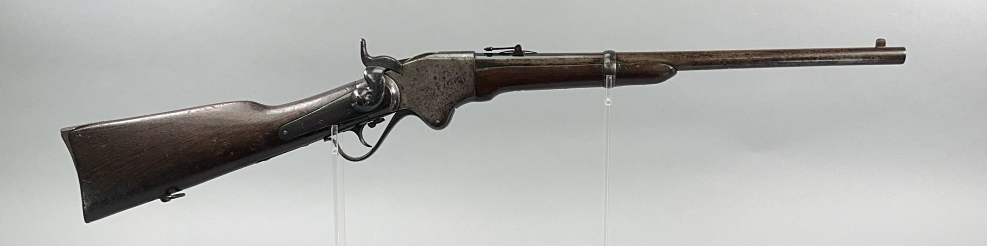 Revolutionary Civil War era rifle that gave Union soldiers a decisive advantage with its 7-shot capacity versus single-shot Confederate weapons. Serial number 12577. The Spencer's rapid-fire capability changed cavalry warfare forever. Rifle has 20" barrel, saddle ring and what appears to be 6 barrel grooves. From a private collection. All seems to operate properly. A great addition to any military collection.