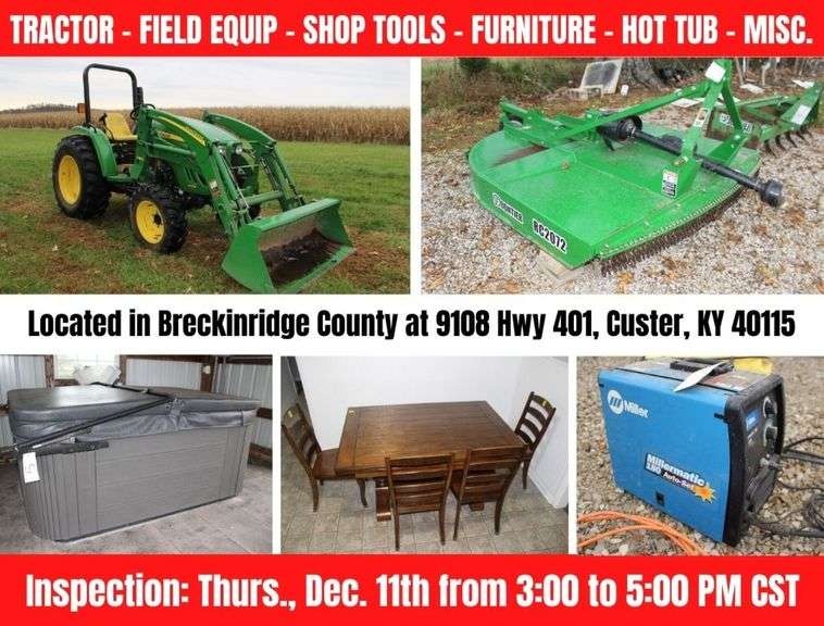 TERMS & CONDITIONS: PERSONAL PROPERTY: Payment in full and possession given day of item pickup, with the exception of any titled automobiles/boats/trailers after being transferred at the courthouse with proof of transfer supplied to auctioneers. Acceptable forms of payment are cash or good check. NO CREDIT OR DEBIT CARDS ACCEPTED. No items will be shipped, no exceptions. Other online bidding terms apply. BUYERS PREMIUM: A 10% buyer’s premium will be added to all winning bids to determine the final selling price. SALES TAX: A 6% KY sales tax will be charged on the final selling price on all taxable items. IMPORTANT NOTICE: All property sold as is where is condition with no warranty or guarantee expressed or implied. Although information has been obtained from sources deemed reliable, neither the seller nor the auctioneer makes any warranty or guarantee, expressed or implied, as to the accuracy of the information herein contained. It is for this reason that buyers should avail themselves of the opportunity to inspect prior to the auction. All announcements from the auction block take precedence over any printed material or any oral statements made. Not responsible for accidents.