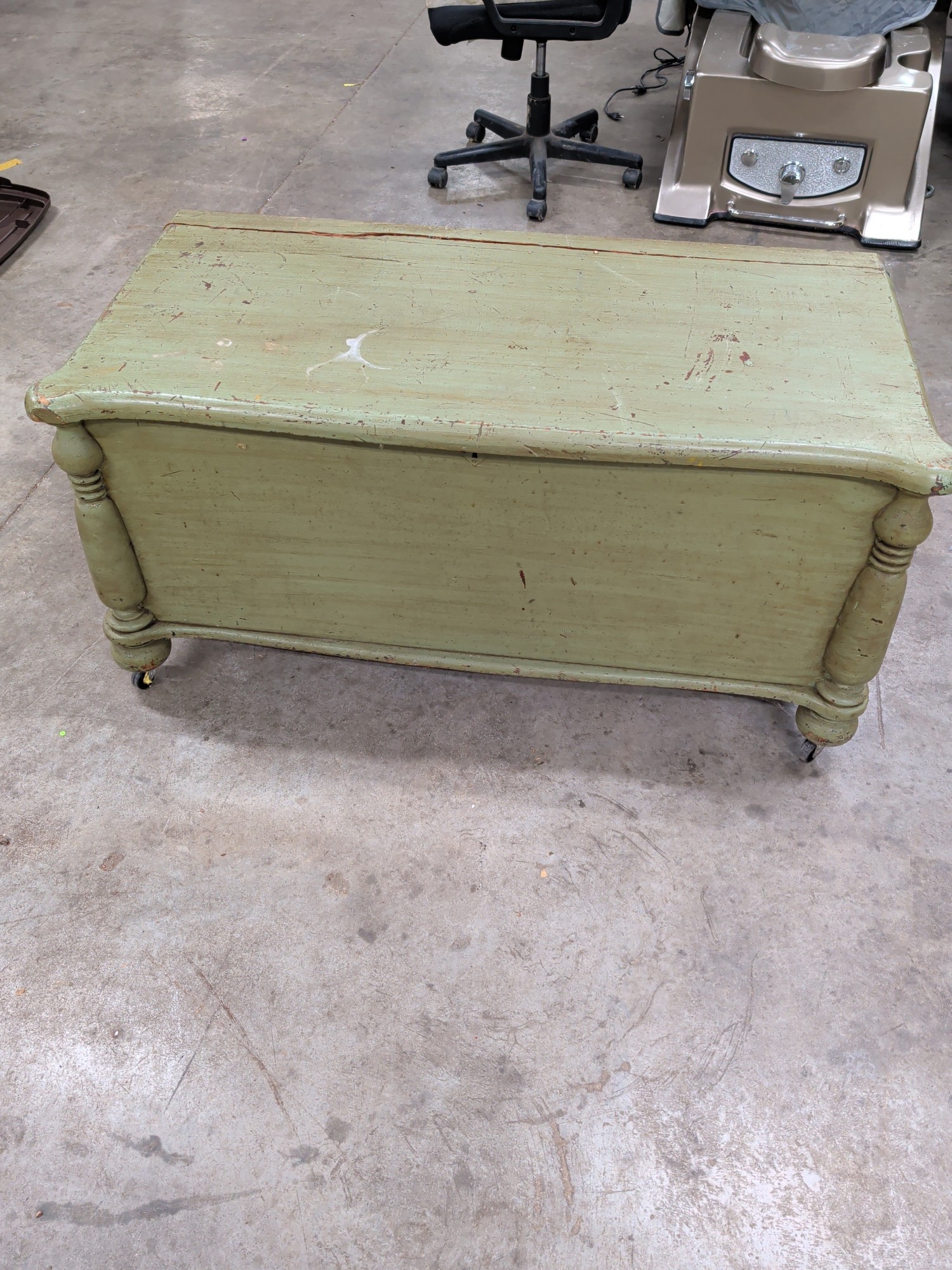 VINTAGE CEDAR CHEST PAINTED GREEN TOP IS SPLIT AND NEEDS GLUED 47X22X23