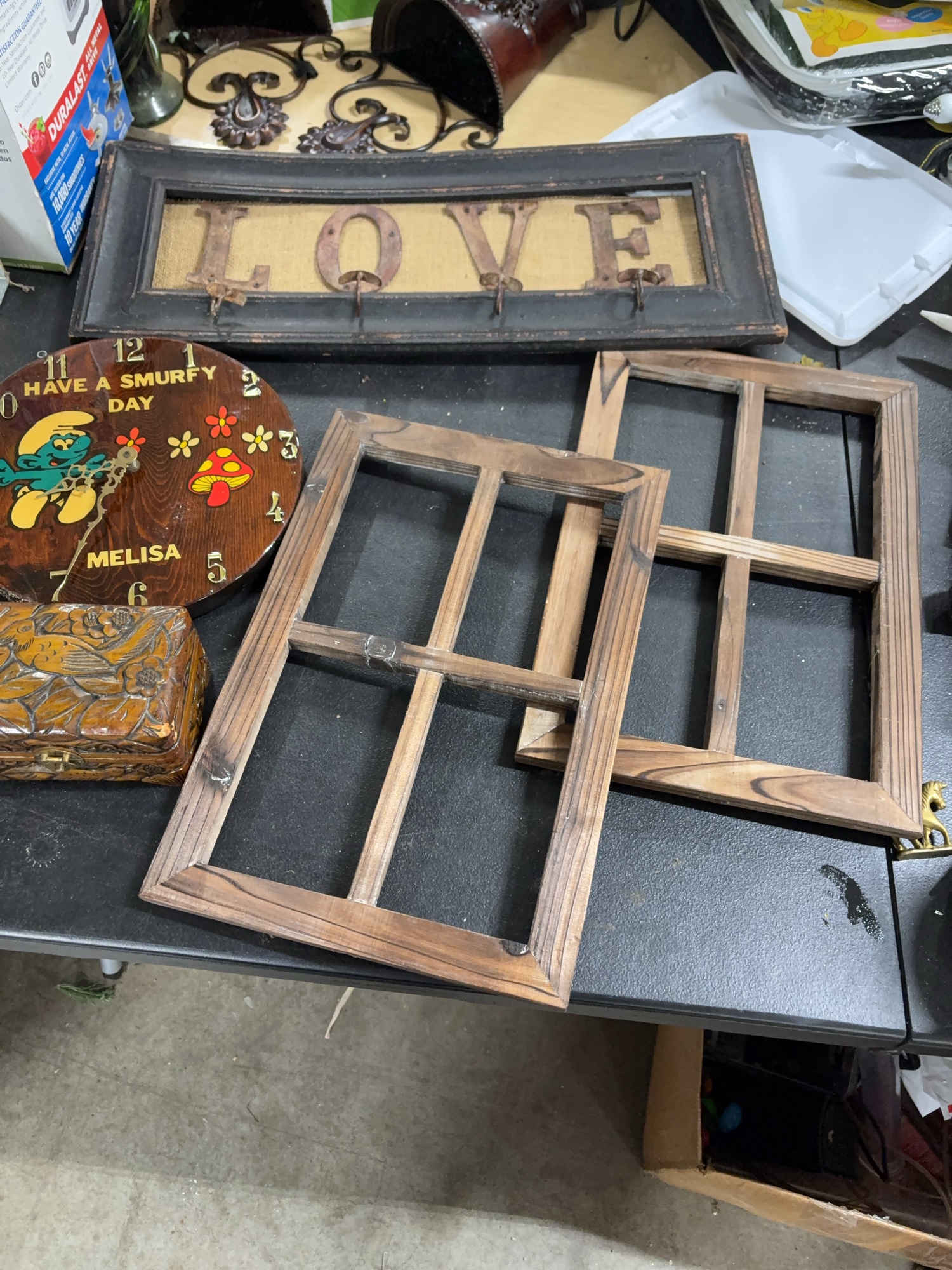 2-WOOD PICTURE FRAMES- WOOD SMURF CLOCK- WOOD JEWELRY BOX- LOVE WALL DECOR-