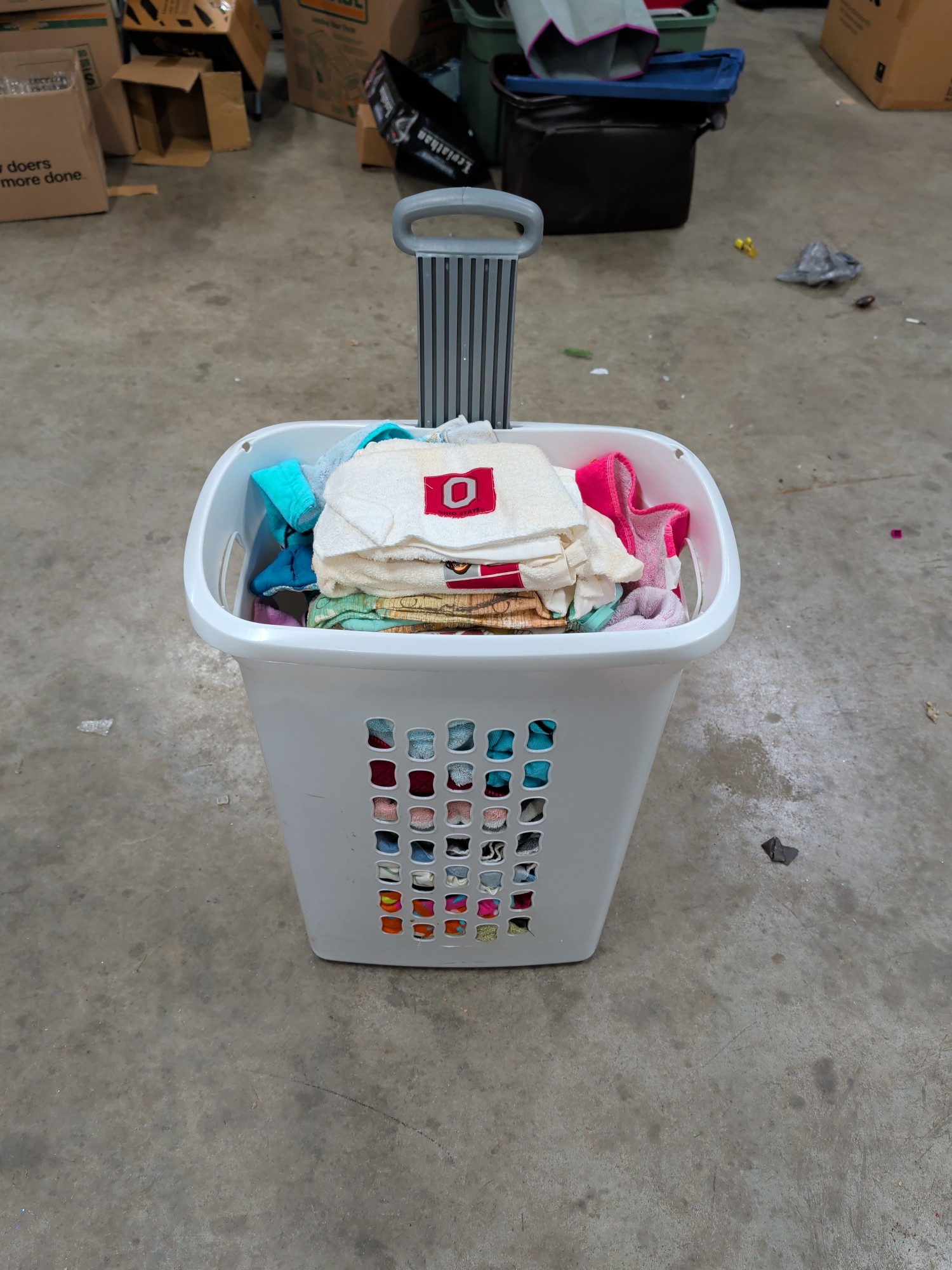 LAUNDRY BASKET OF TOWELS AND WASH CLOTHS