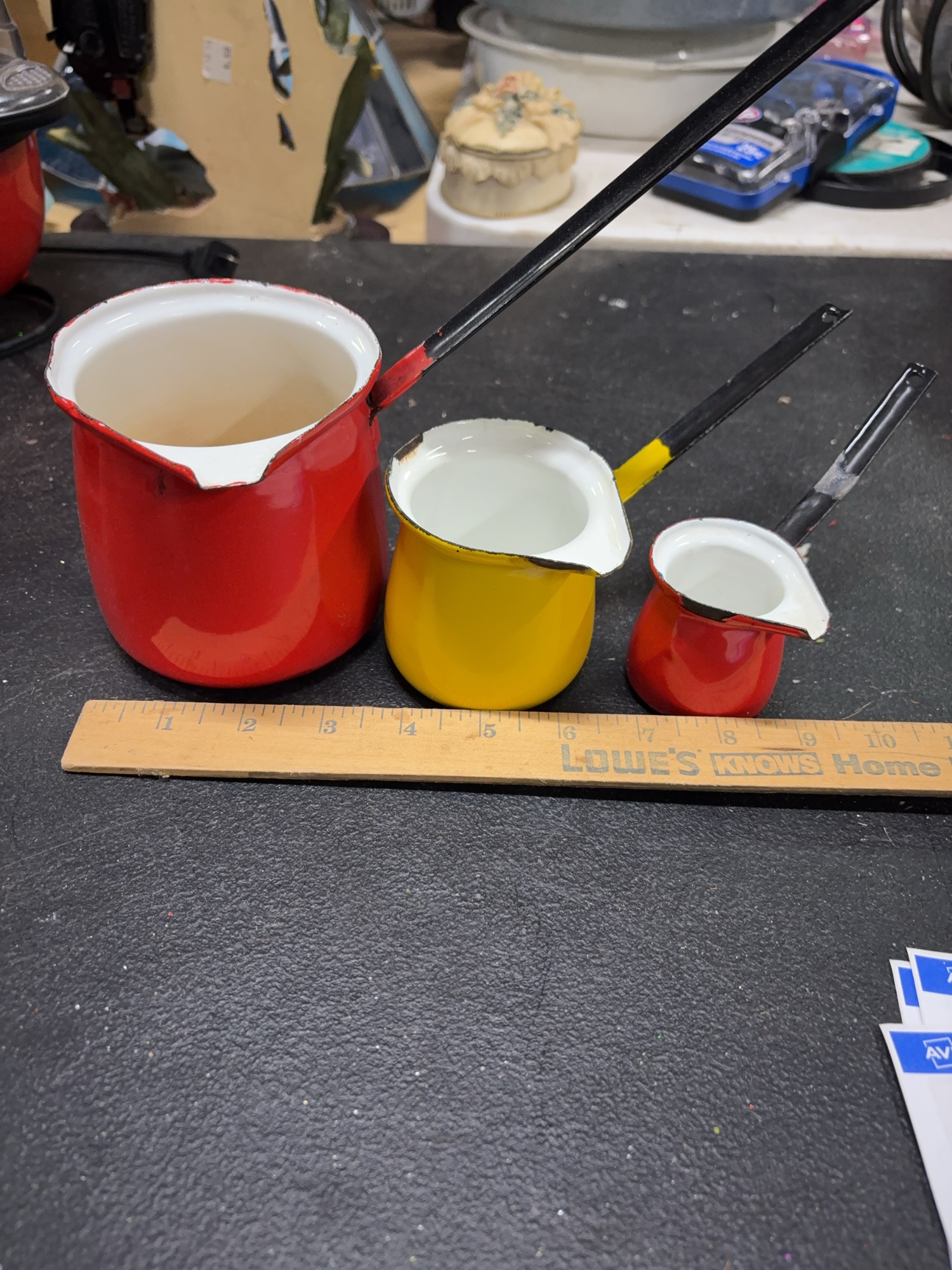 3- VINTAGE- ENAMEL WARE BUTTER WARMERS AND SAUCE POURERS-