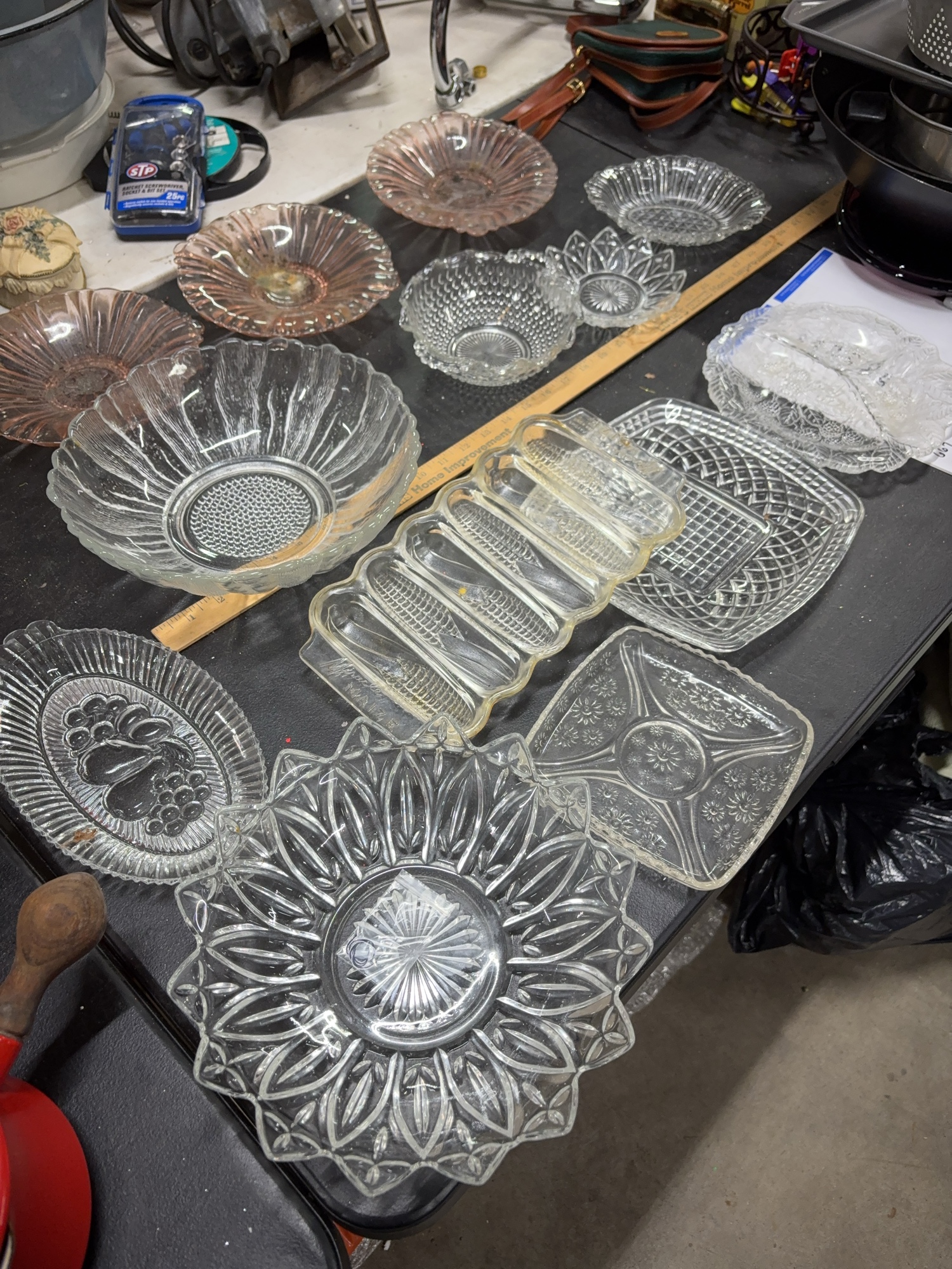 SEVERAL PIECES OF CLEAR GLASSWARE- & PINK DEPRESSION DISHES- MIRACLE MAZE- GLASS CORNBREAD BAKING DISH/ MOLD