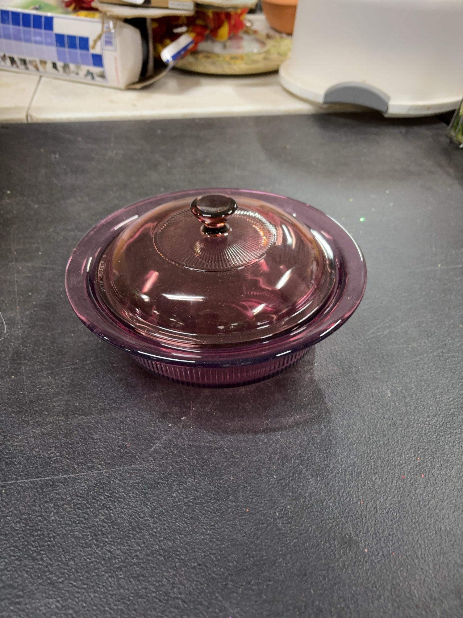 CORNING VISION- CRANBERRY COLORED- ROUND- CASSEROLE DISH WITH LID-