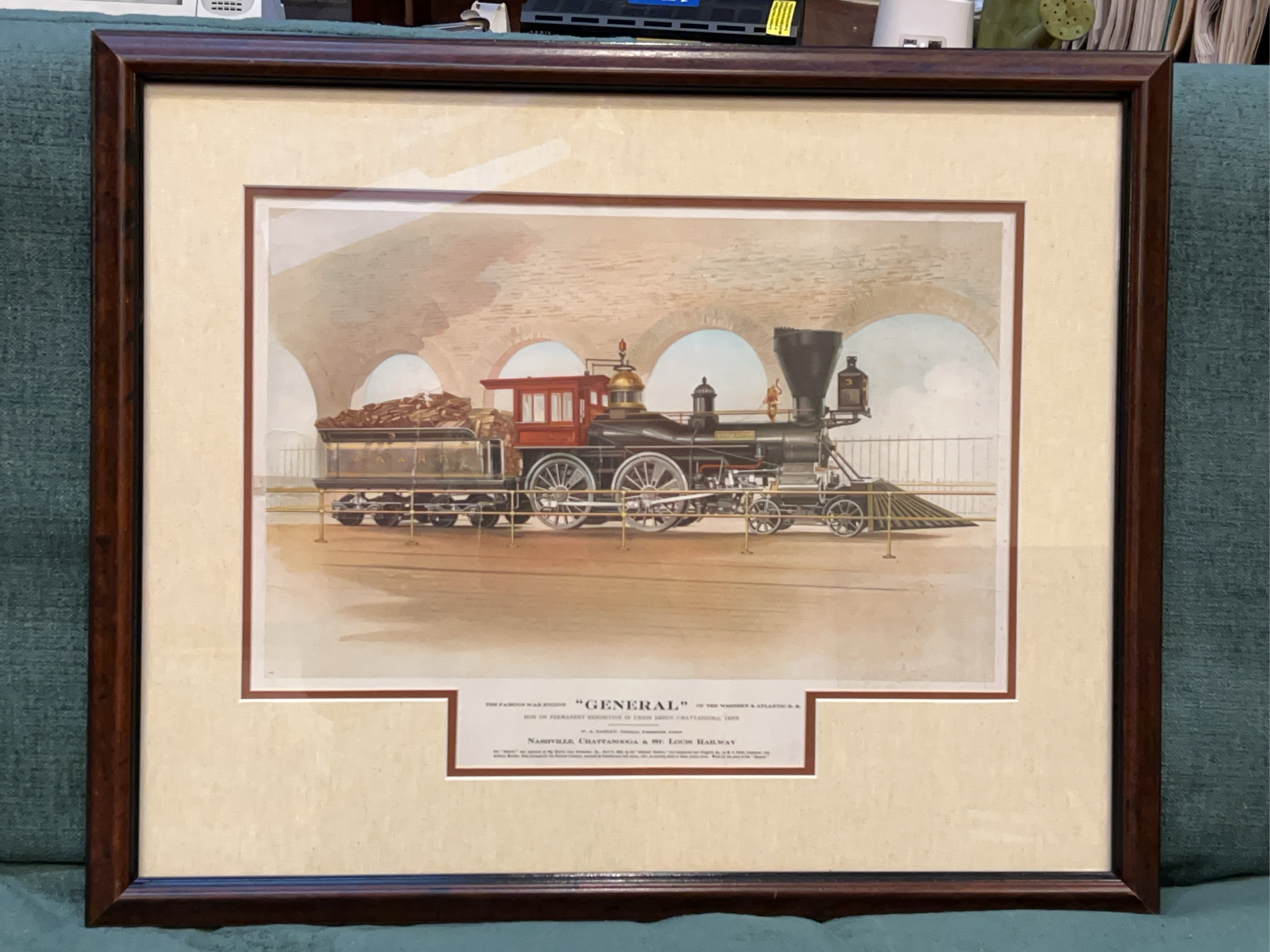 Framed print of the locomotive known as "The General," famous for its role in the American Civil War. The text below the image identifies it as the "FAMOUS WAR ENGINE 'GENERAL’”……27-3/4 x 22-3/4