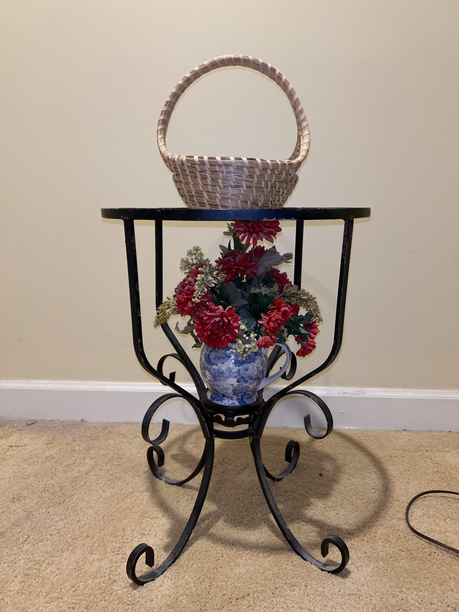 Smaller black metal base glass top table and contents….15-1/2”D x 21” tall