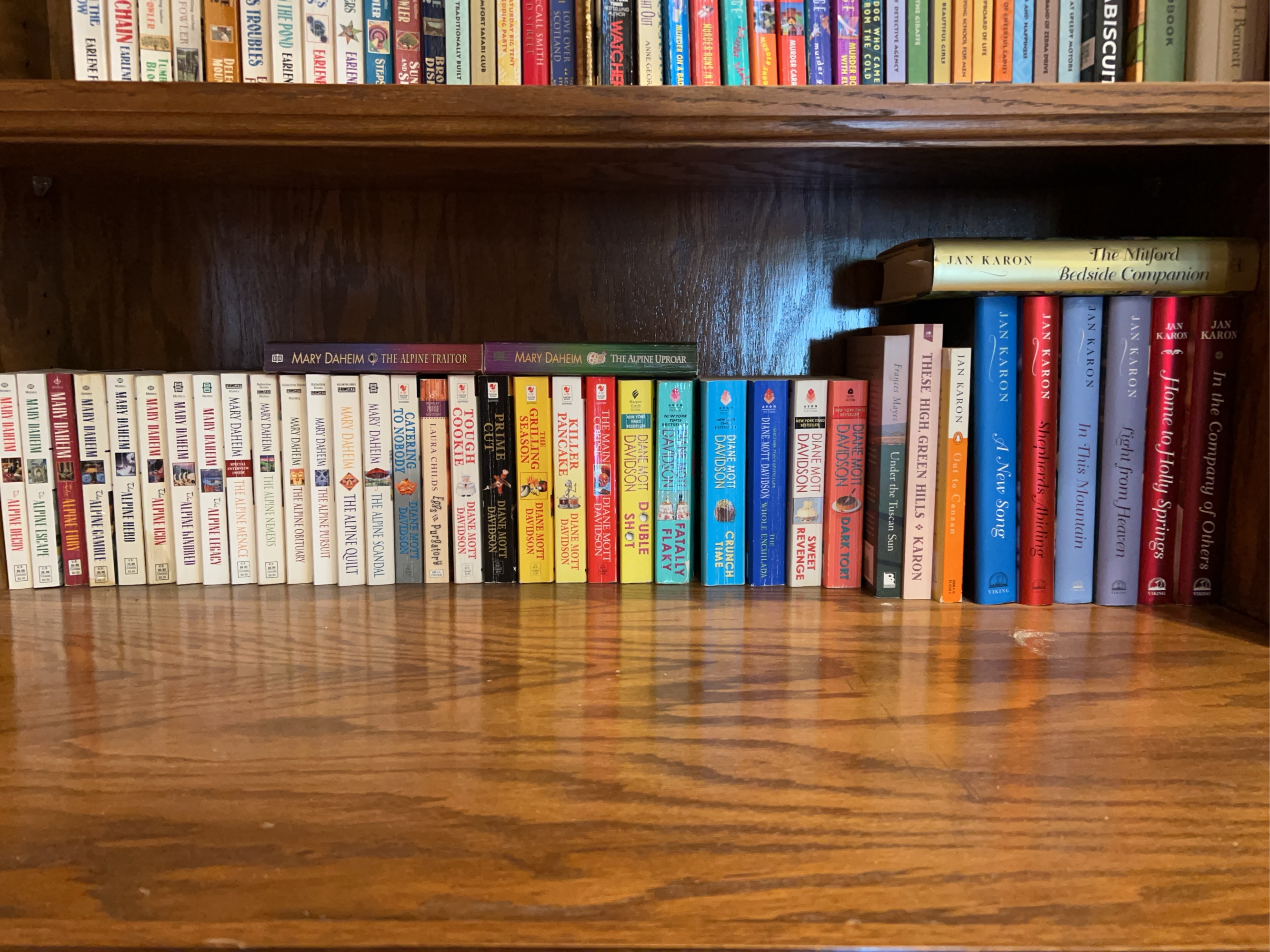 Bottom shelf of books…..authors include Mary Daheim, Diane Mott Davidson, Jan Karon