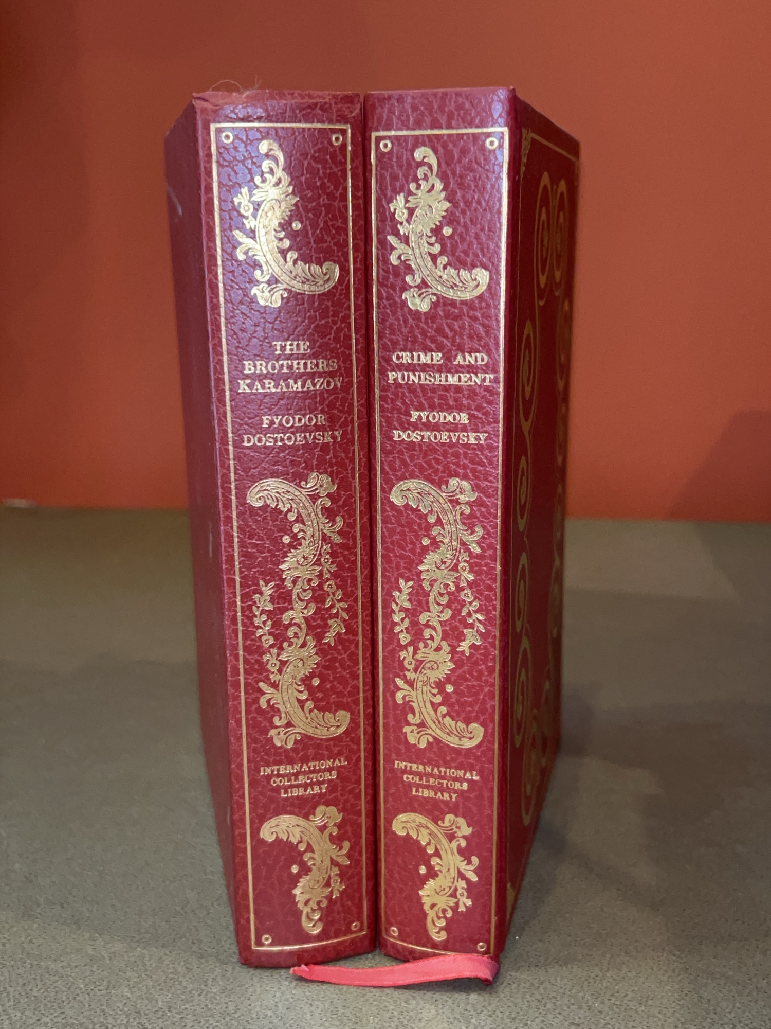 “The Brothers Karamazov” and “Crime and Punishment” by Fyodor Dostoevsky…..both are leather bound, gold stamped, ribbon bookmark and gold gilt edges