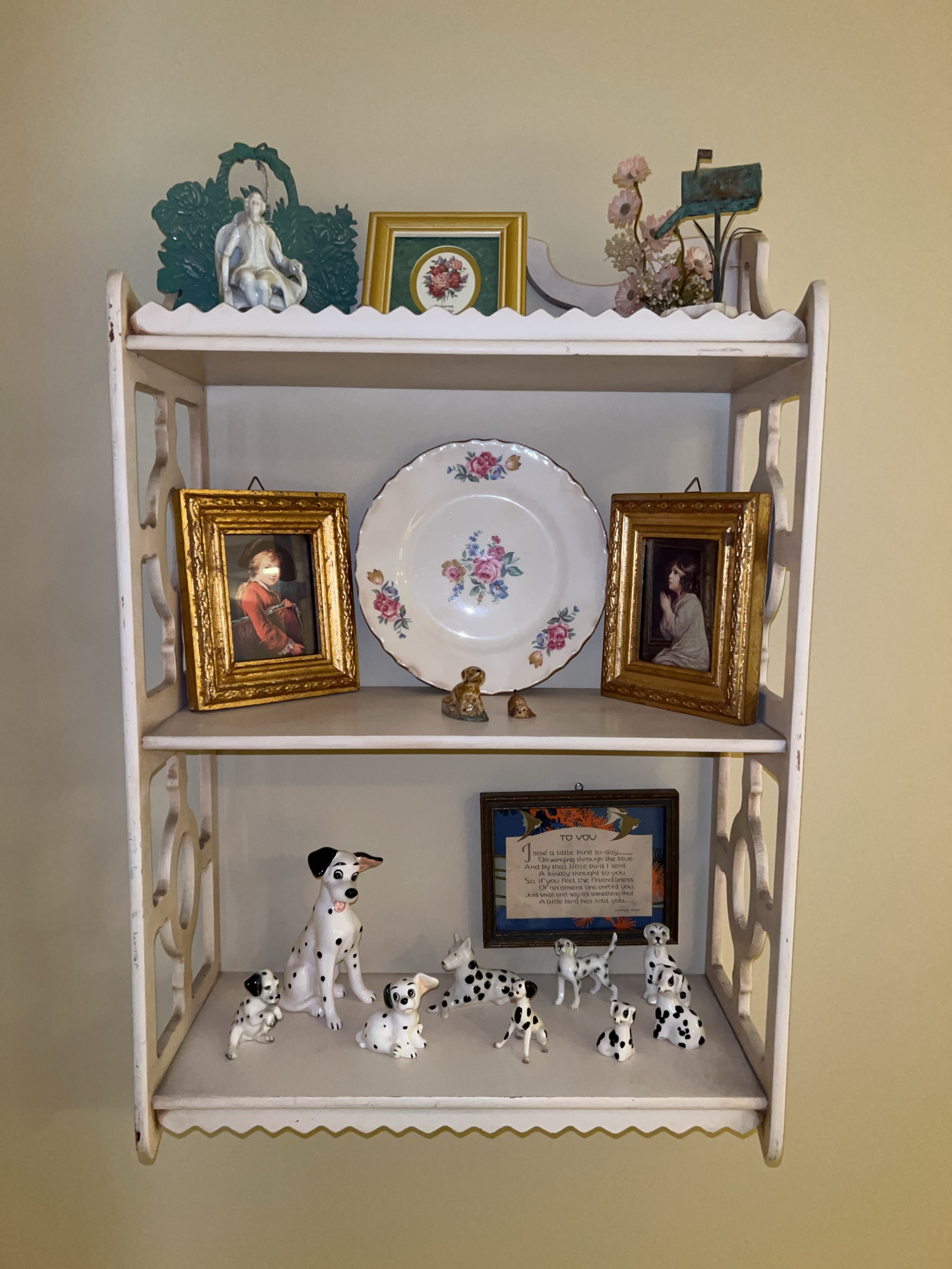 Decorative white wood wall shelf and contents…..porcelain/ceramic Dalmatians and other home decor…..15-1/2 x 6-3/4 x 26 tall…..top porcelain piece is damaged