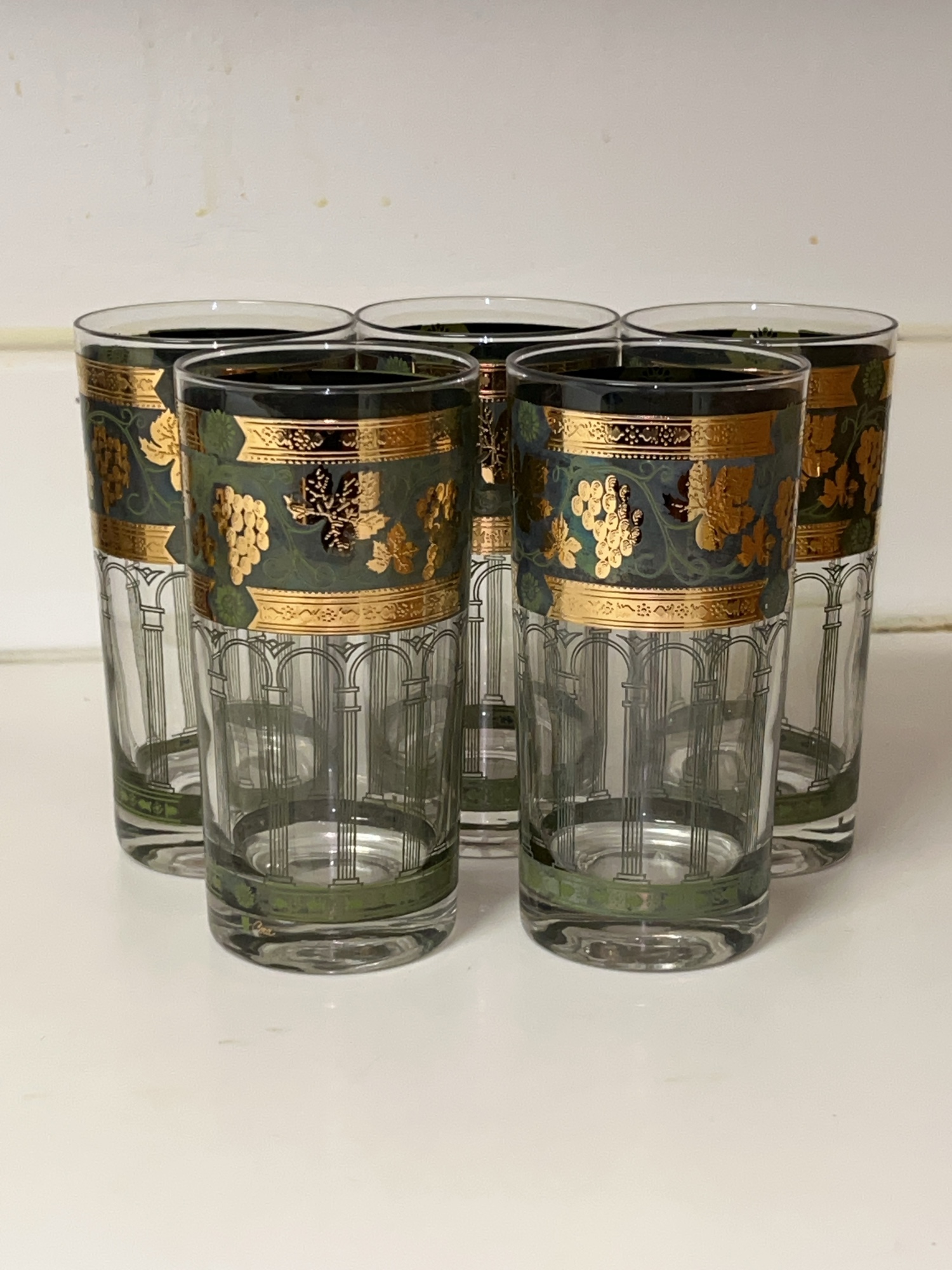 Set of (5) Vintage Mid Century Modern Cera Glass Gold & Green Grape Highball Tumbler Glass