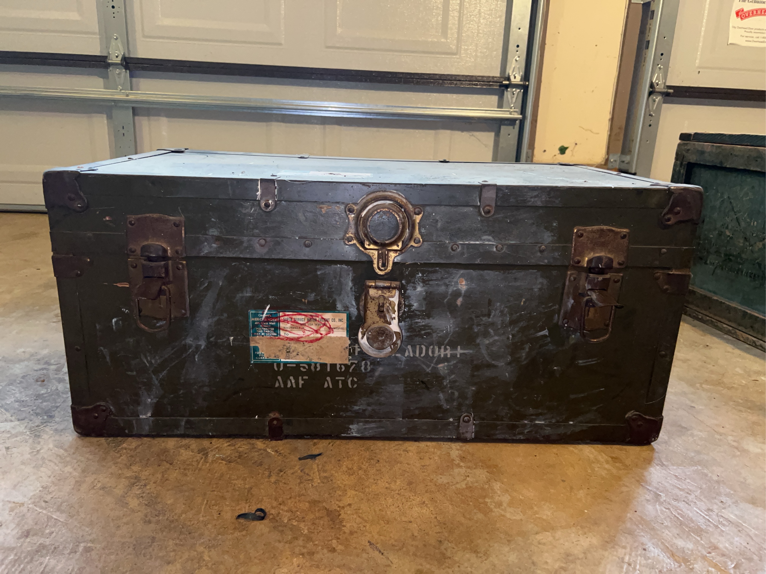 Vintage military foot locker…..31 x 17 x 14-1/4 tall….both handles are missing