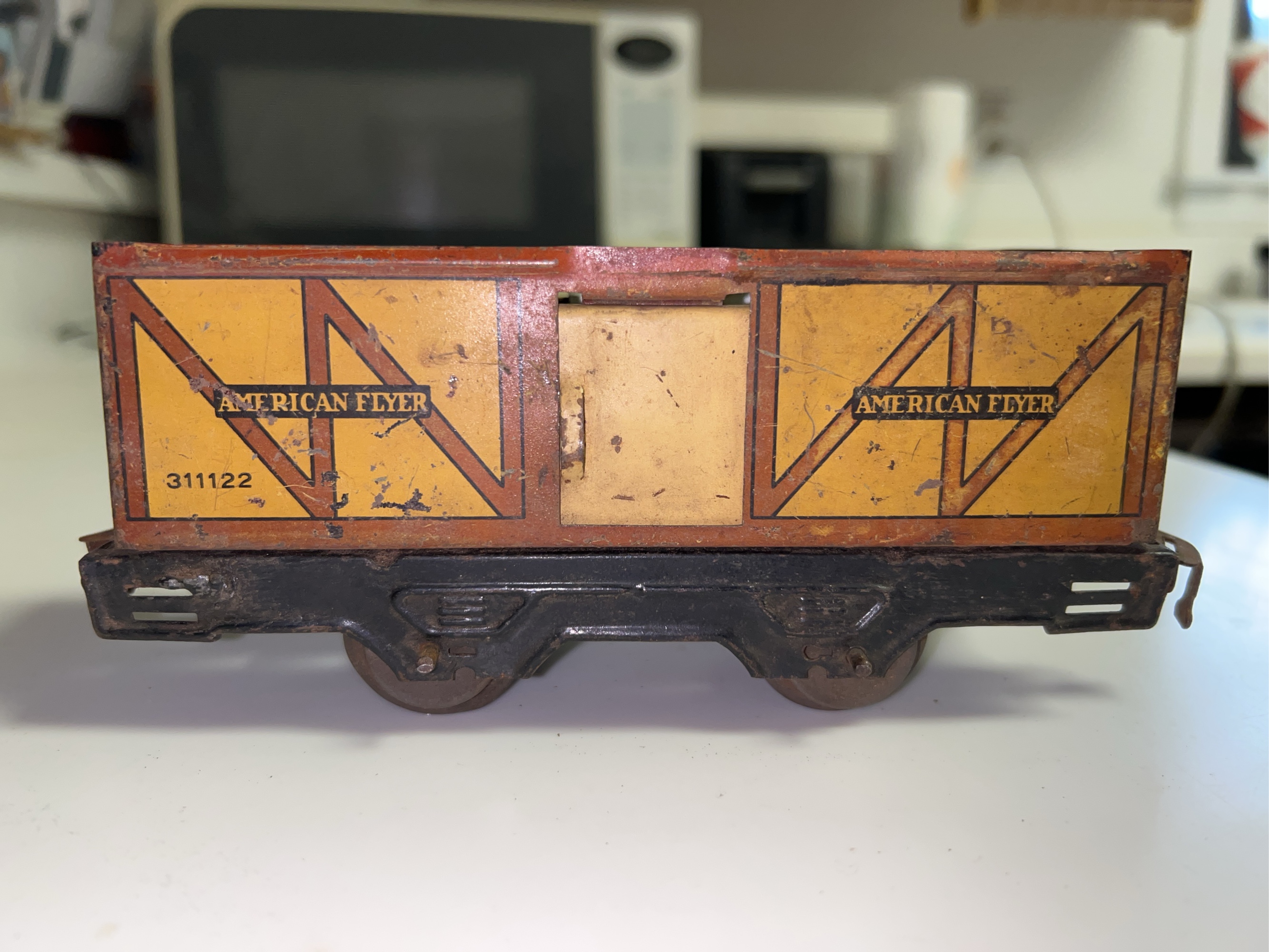 Vintage American Flyer tin litho O gauge boxcar….doors on both sides open close easily
